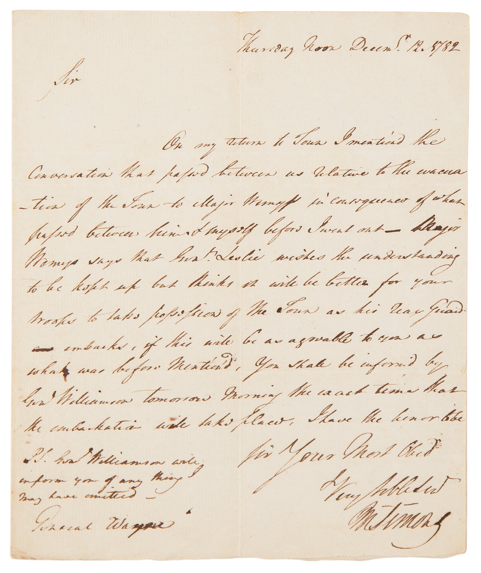 ALS signed "M. Simons," one page, 6.25 x 7.5, December 12, 1782. Handwritten letter to General 'Mad Anthony' Wayne, in part: "On my return to Town I mentioned the Conversation that passed between us relative to the evacuation of the Town to Major Wemys in consequence of what passed between him & myself…Major Wemys says that Genl. Leslie wishes the understanding to be kept up but thinks it will be better for your troops to take possession of the Town as his rear Guard embarks…You shall be inform'd by Genl. Williamson tomorrow morning the exact time that the embrakation will take place." Docketed on the reverse in Wayne's hand, "12th Dec. 1782 from Colo. M. Simons." The British completed their evacuation of Charleston two days later, on December 14, 1782. Their rear guard marched for Gadsden's Wharf, located on the Cooper River, where they boarded ships and sailed into the harbor, ending over two years of British occupation.
