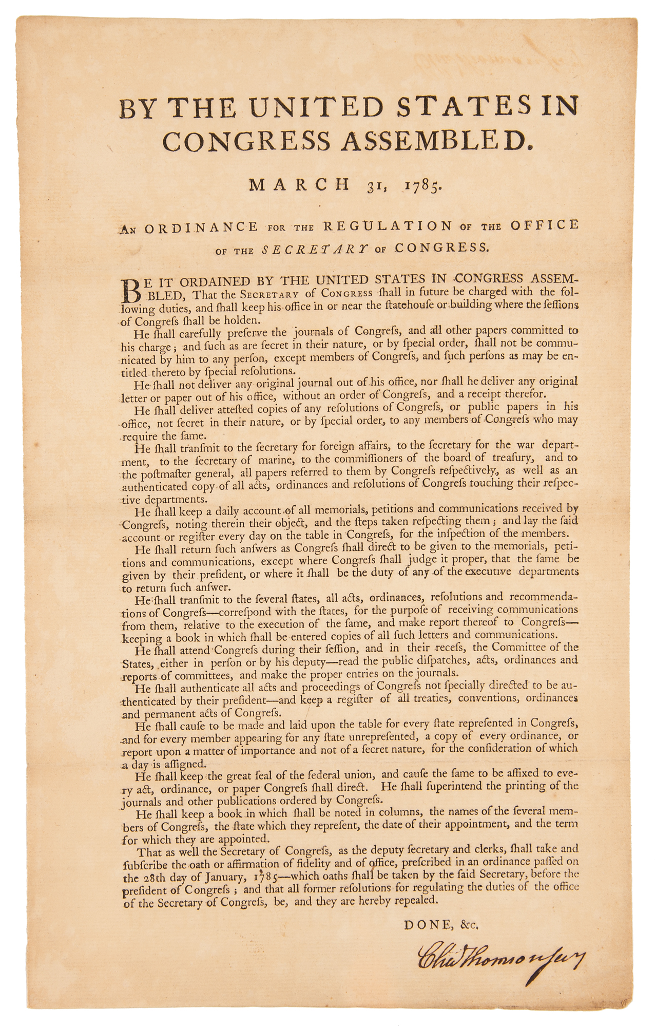 Patriot leader (1729–1824) in Philadelphia during the American Revolution and the secretary of the Continental Congress (1774–1789) throughout its existence; Thomson was the only person to sign the Dunlap Broadside of the Declaration alongside John Hancock. Scarce and important broadside printing of "An Ordinance for the Regulation of the Office of the Secretary of Congress," one page, 8 x 12.75, March 31, 1785, boldly signed at the conclusion in ink, "Cha. Thomson, Sec'y." The document details the duties of the secretary, including various record keeping activities, the delivery of attested copies of documents, the transmission of papers to state and federal officials, and the protection of the great seal of the union.