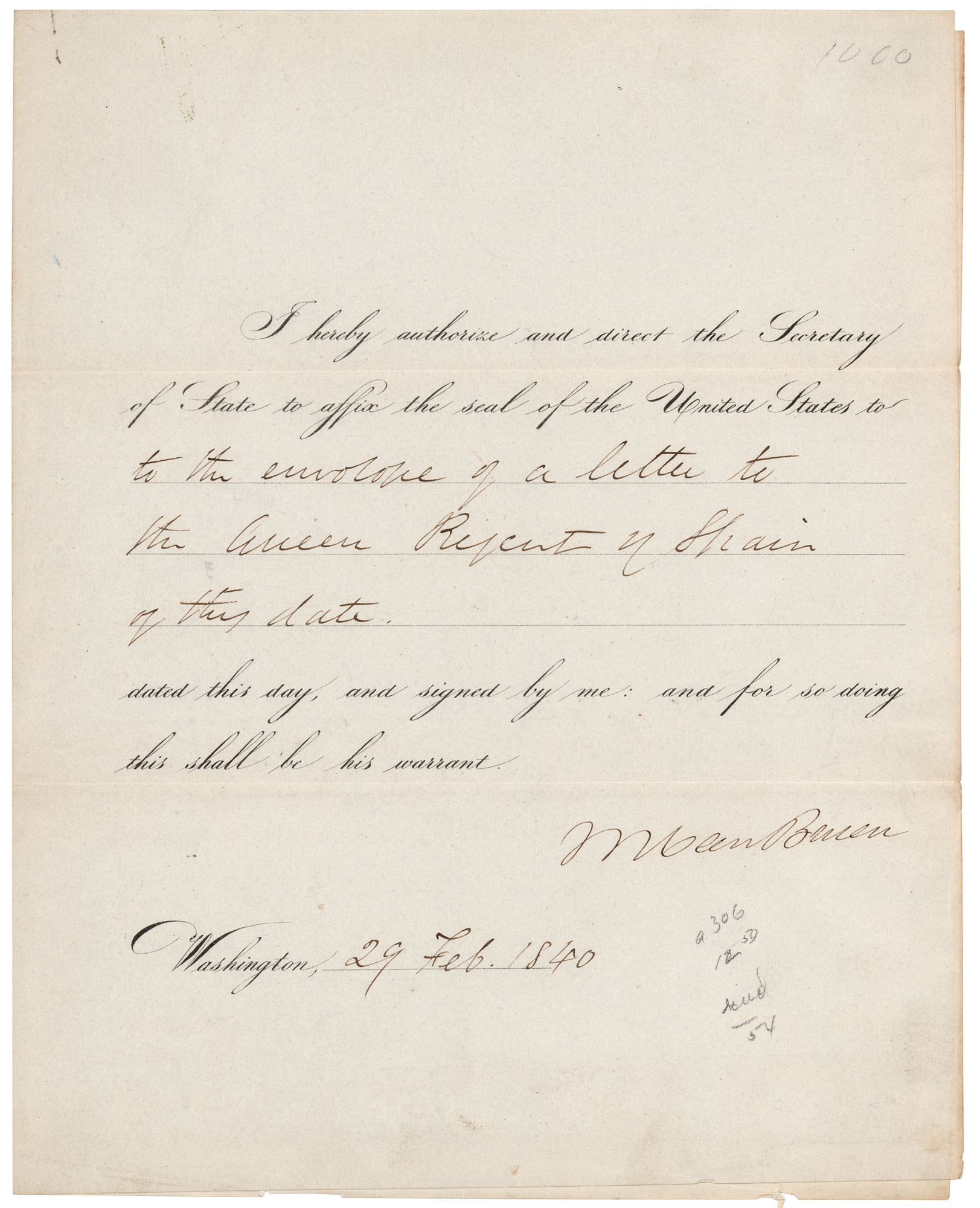 Partly-printed DS as president, signed “M. Van Buren,” one page, 8 x 10, February 29, 1840. President Van Buren authorizes and directs "the Secretary of State to affix the seal of the United States to the envelope of a letter to the Queen Regent of Spain of this date." Neatly signed at the conclusion in ink by President Martin Van Buren. In fine condition.