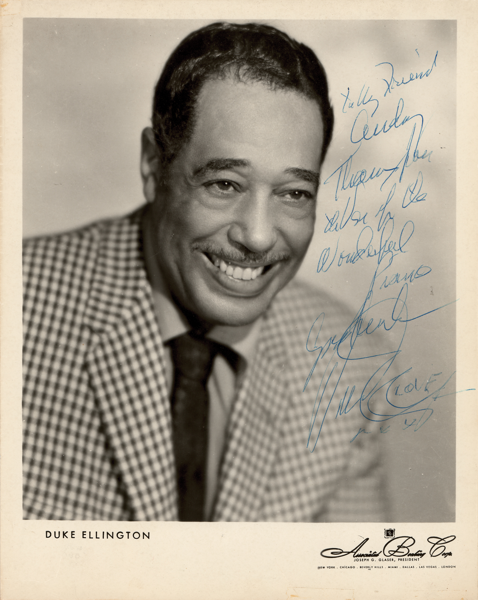 Vintage glossy 8 x 10 Associated Booking Corp. promo photo of Duke Ellington cracking a big smile, signed and inscribed in blue ballpoint, "To my friend Andy, Thanks for the use of the wonderful piano, Good luck, Duke Ellington.” In fine condition, with a few light surface creases.