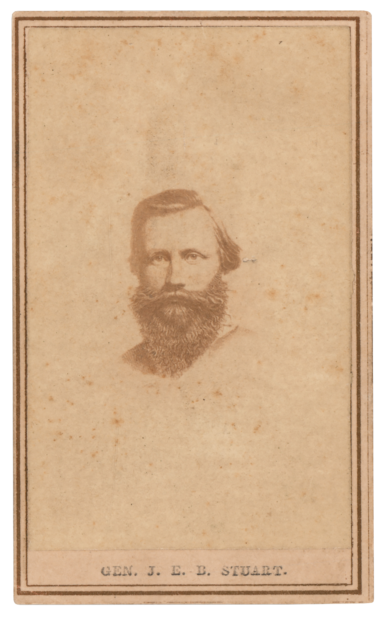 Uncommon 2.5 x 4 carte-de-visite photograph of J. E. B. Stuart, which features an engraved portrait of the Confederate General, with typed caption below: “Gen. J. E. B. Stuart." In fine condition.