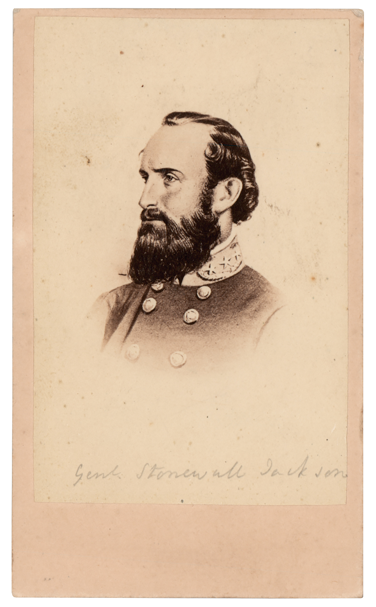 Carte-de-visite photograph of Thomas J. 'Stonewall' Jackson, 2.5 x 4, featuring an engraved portrait of the Confederate General wearing his military uniform in a bust-length profile pose. Published by E. & H. T. Anthony of New York. The reverse bears an ink notation by an unknown hand. In fine condition.