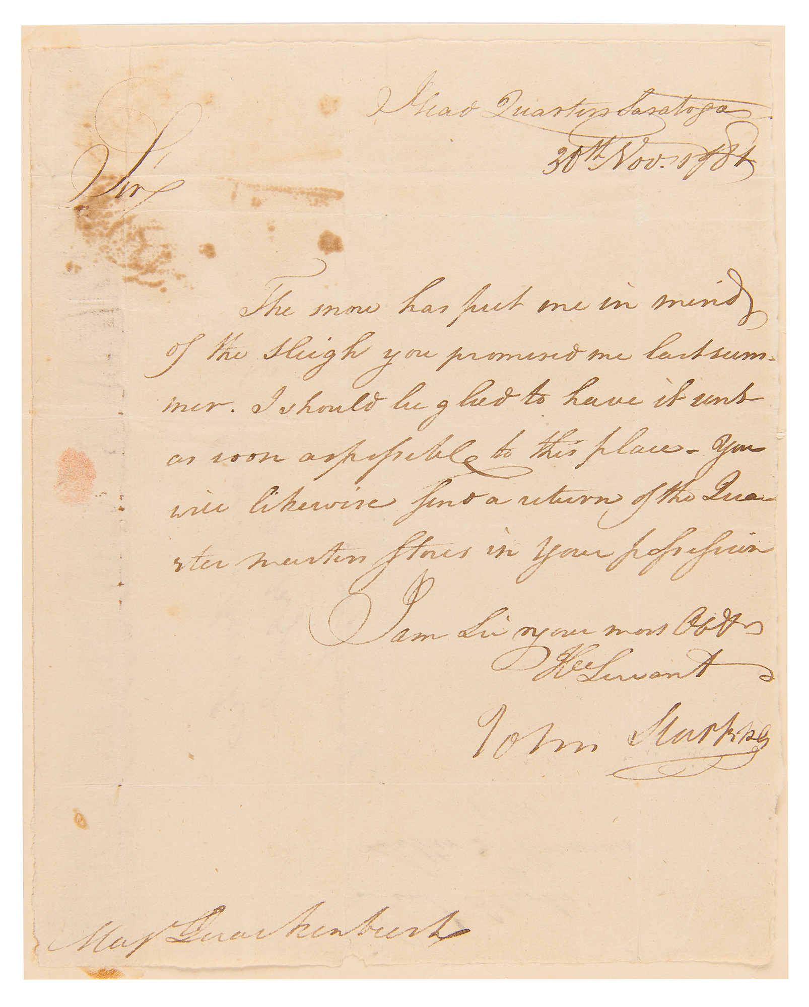 New Hampshire native and military officer (1728-1822) known for coining the phrase that became the state motto, 'Live Free or Die.' He served as a major general in the Continental Army during the American Revolution, participating in the Battles of Bunker Hill, Trenton, Princeton, and Bennington, becoming widely known as the 'Hero of Bennington' for his exemplary service in the latter. Revolutionary War-dated LS signed “John Stark, BG,” one page, 6.75 x 8.25, November 30, 1781. Addressed from Saratoga, New York, a letter to Major Nicholas Quackenbush, Assistant Deputy Quartermaster to the Continental forces in Albany, in full: “The snow has put me in mind of the sleigh you promised me last summer. I should be glad to have it sent as soon as possible to this place. You will likewise find a return of the Quarter master Stores in your possession.” Affixed by its left edge to a slightly larger backing sheet and in very good to fine condition, with staining to the upper left, and show-through along the left edge from a mounting strip on the back. Accompanied by an engraved portrait of Stark bearing a preprinted signature.