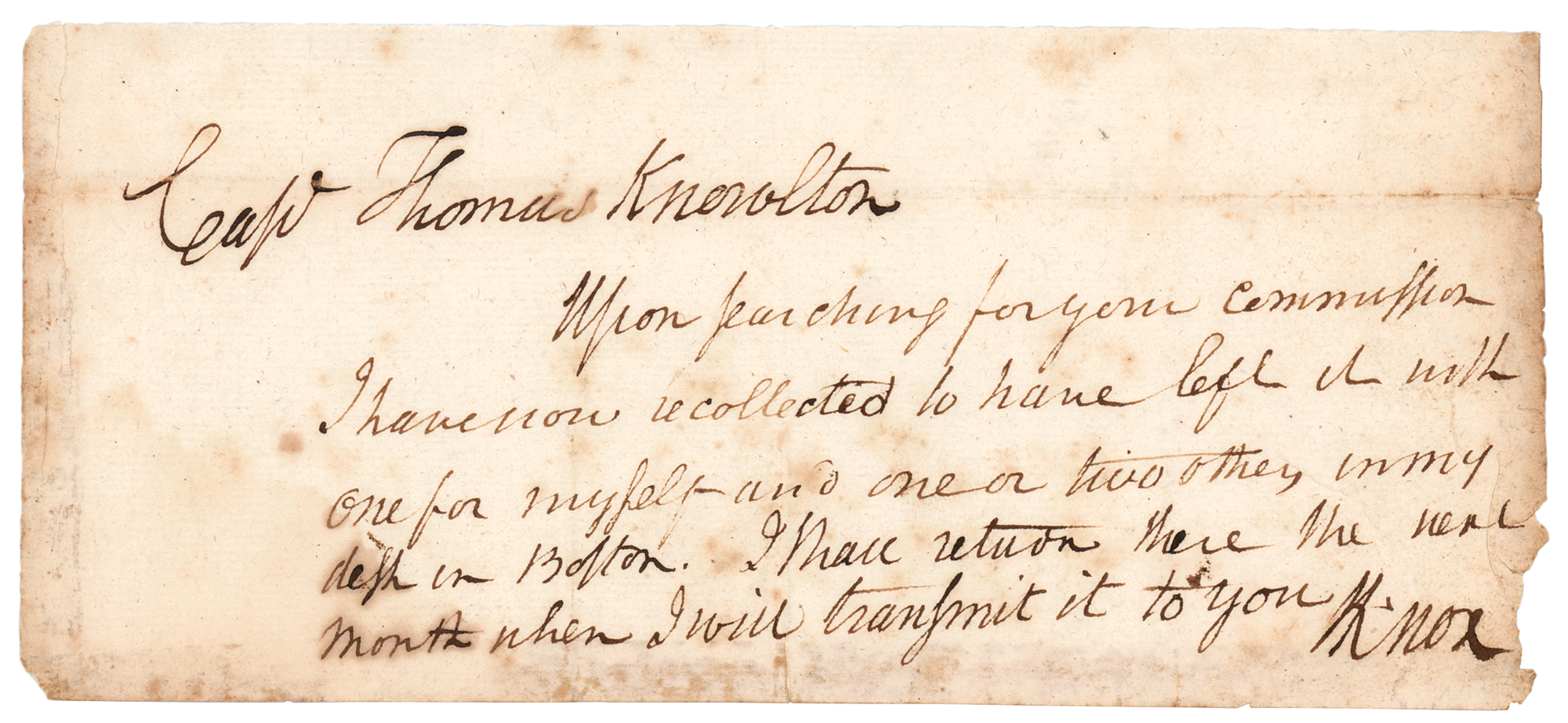 Revolutionary War general (1750–1806) who was the first United States Secretary of War. He established the Continental Army's first school for artillery and officer training, a facility that served as the precursor to the United States Military Academy at West Point, New York. Revolutionary War-era ALS signed “Knox,” one page, 8.5 x 3.75, no date [circa mid-1776]. Handwritten letter to Captain Thomas Knowlton, in full: “Upon searching for your commission I have now recollected to have left it with one for myself and one or two others in my desk in Boston. I shall return there the next month when I will transmit it to you.” In very good to fine condition, with scattered light foxing, light edge staining, and minor loss to the lower right corner.