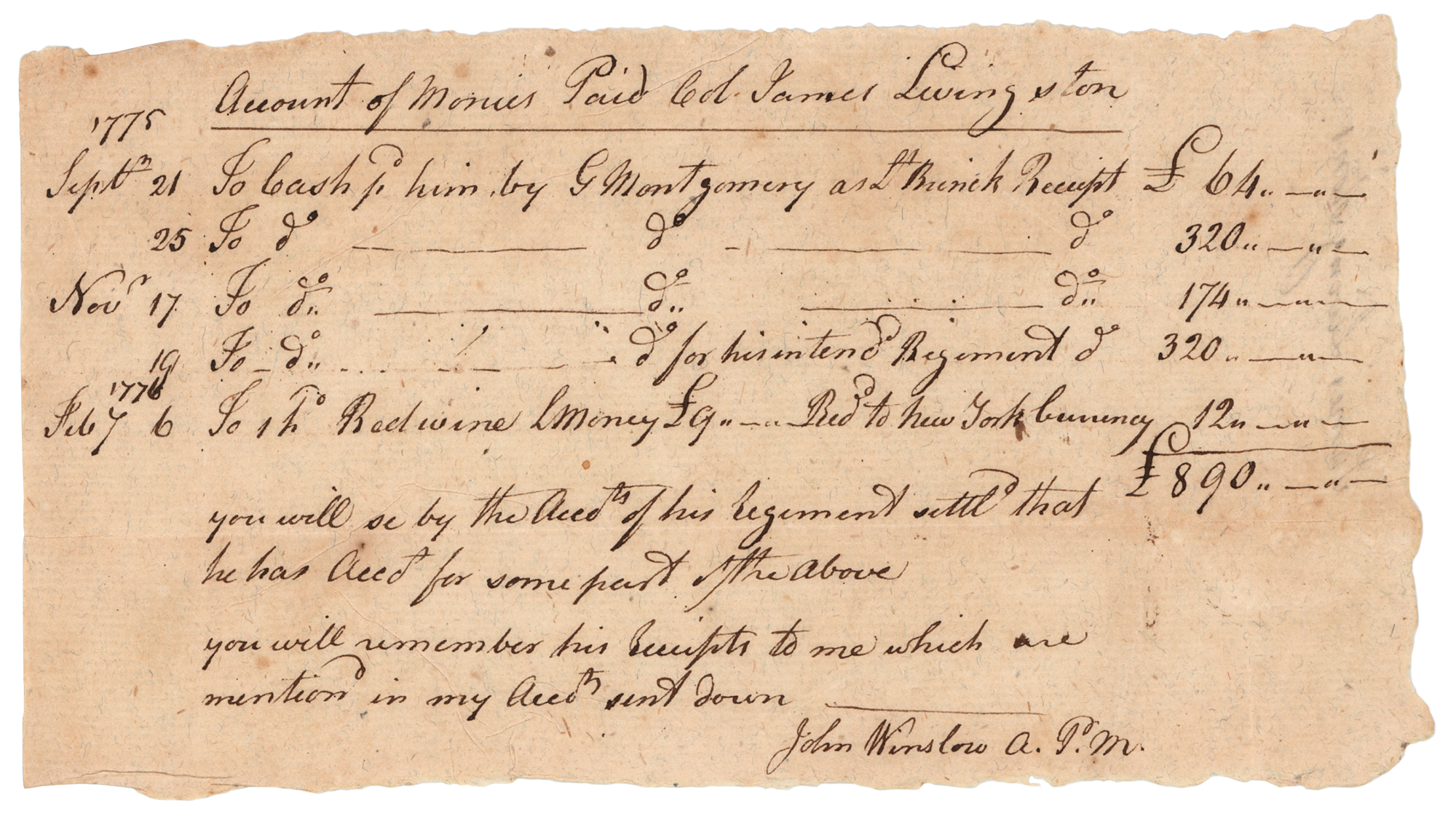 Revolutionary War-dated manuscript document signed “John Winslow, A.P.M.,” one page, 7.25 x 4, early 1776. A handwritten “Account of Monies Paid Col. James Livingston” from September 1775 to February 1776, which includes a “Cash p’d him by G. Montgomery” and amounts to a total of £890. The lower portion reads: “You will see by the Acco’ts of his Regiment settl’d that he has Acco’t for some part of the above, you will remember his Receipts to me which are mention’d in my Acco’ts sent down.” In fine condition.