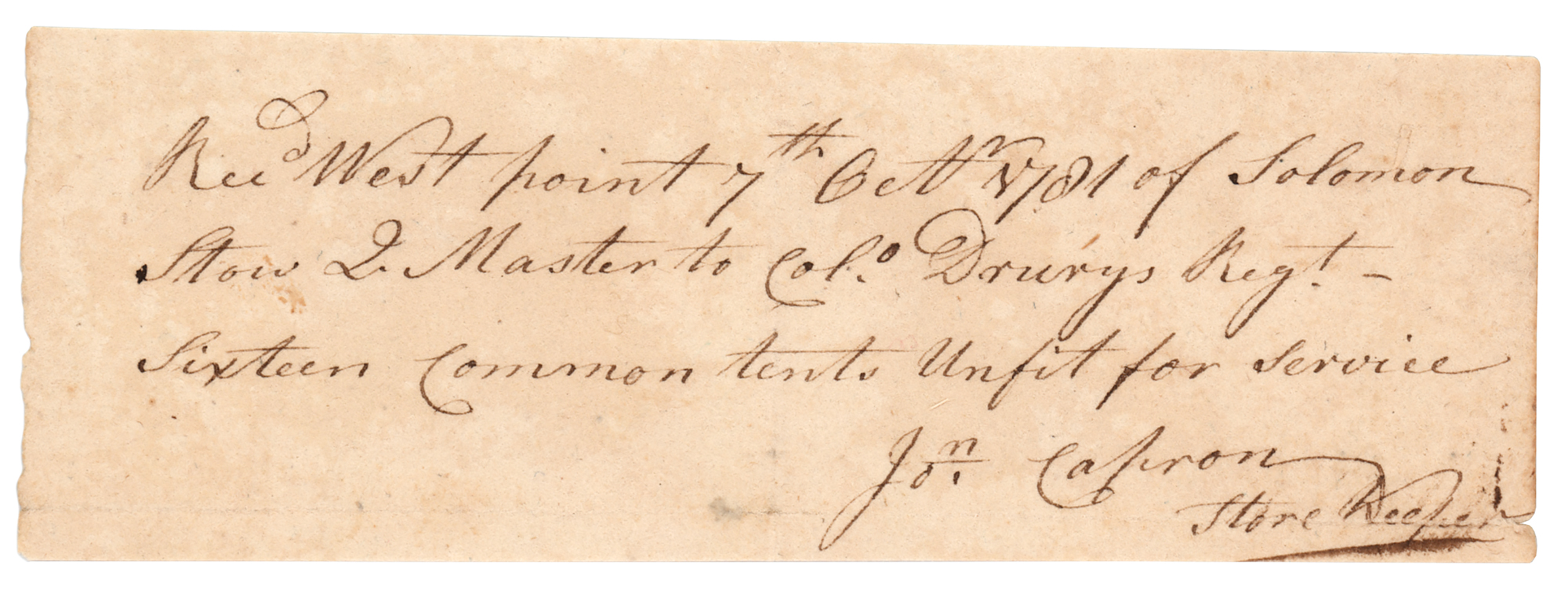 Revolutionary War-dated manuscript document, one page, 5.75 x 2, October 7, 1781. Receipt from West Point, New York, which notes that Colonel Luke Drury's regiment received “sixteen common tents unfit for service.” Signed at the conclusion by John Capron as store keeper. In fine condition.