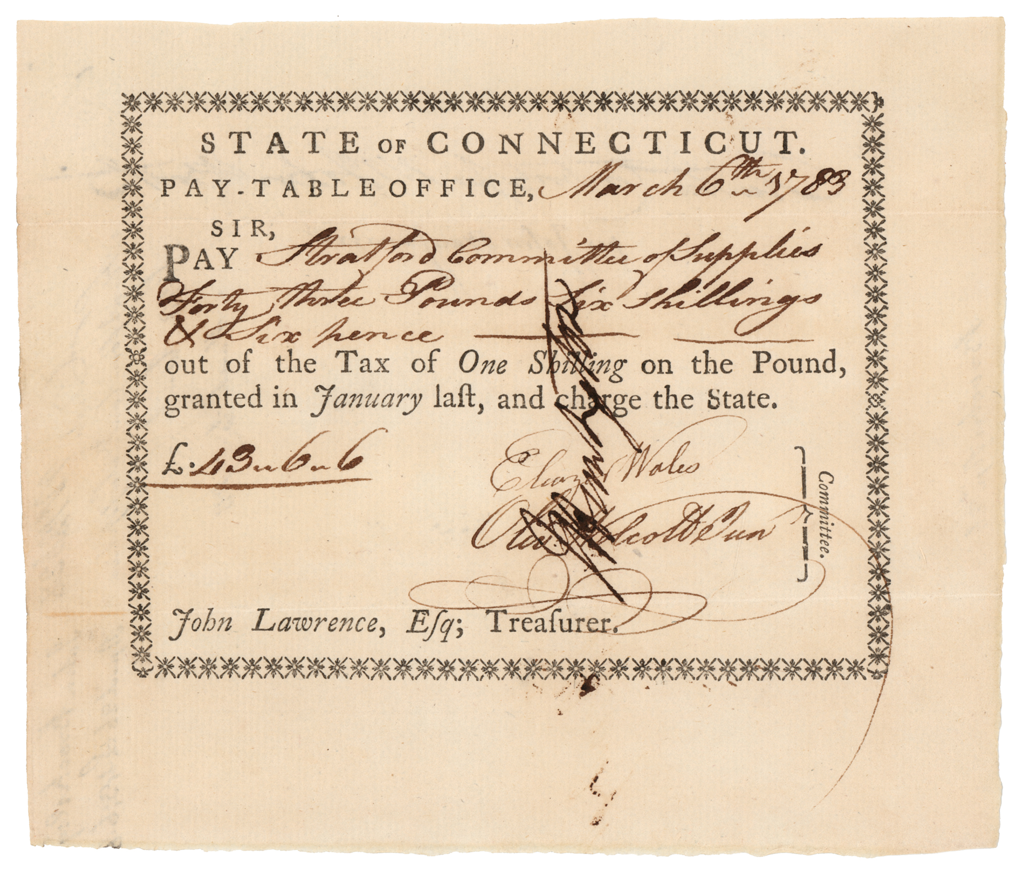 Revolutionary War-dated partly-printed DS, signed "Oliv. Wolcott, Jr.," one page, 6.5 x 5.5, March 6, 1783. State of Connecticut pay order, in part: “Pay Stratford Committee of Supplies Forty three Pounds Six shillings & six pence out of the Tax of One Shilling on the Pound, granted in January last, and charge the State." Signed at the conclusion by Wolcott, and countersigned by Jedediah Huntington, who signs vertically, and Eleazer Wales. In fine condition.