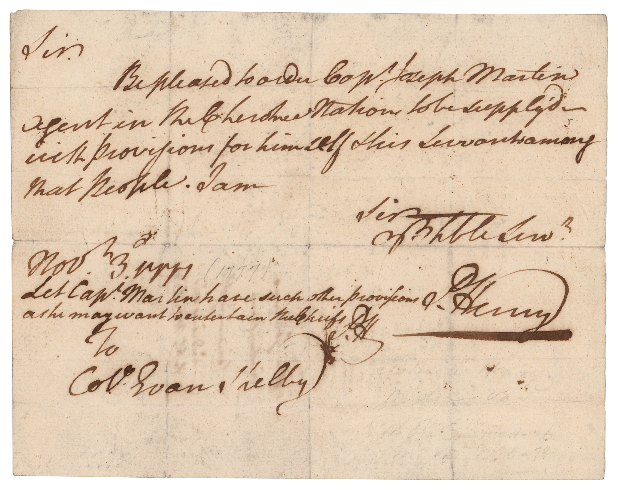 ADS as governor of Virginia, signed “P. Henry,” one page, 8 x 6.25, November 3, 1777. Handwritten order sent to Colonel Evan Shelby, in full: “Be pleased to order Cap’t Joseph Martin, agent in the Cherokee Nation to be supplied with provisions for himself & his Servants among that people.” Henry his initials to a postscript: “Let Cap’t Martin have such other provisions as he may want to entertain the Chiefs. P.H.” In fine condition.