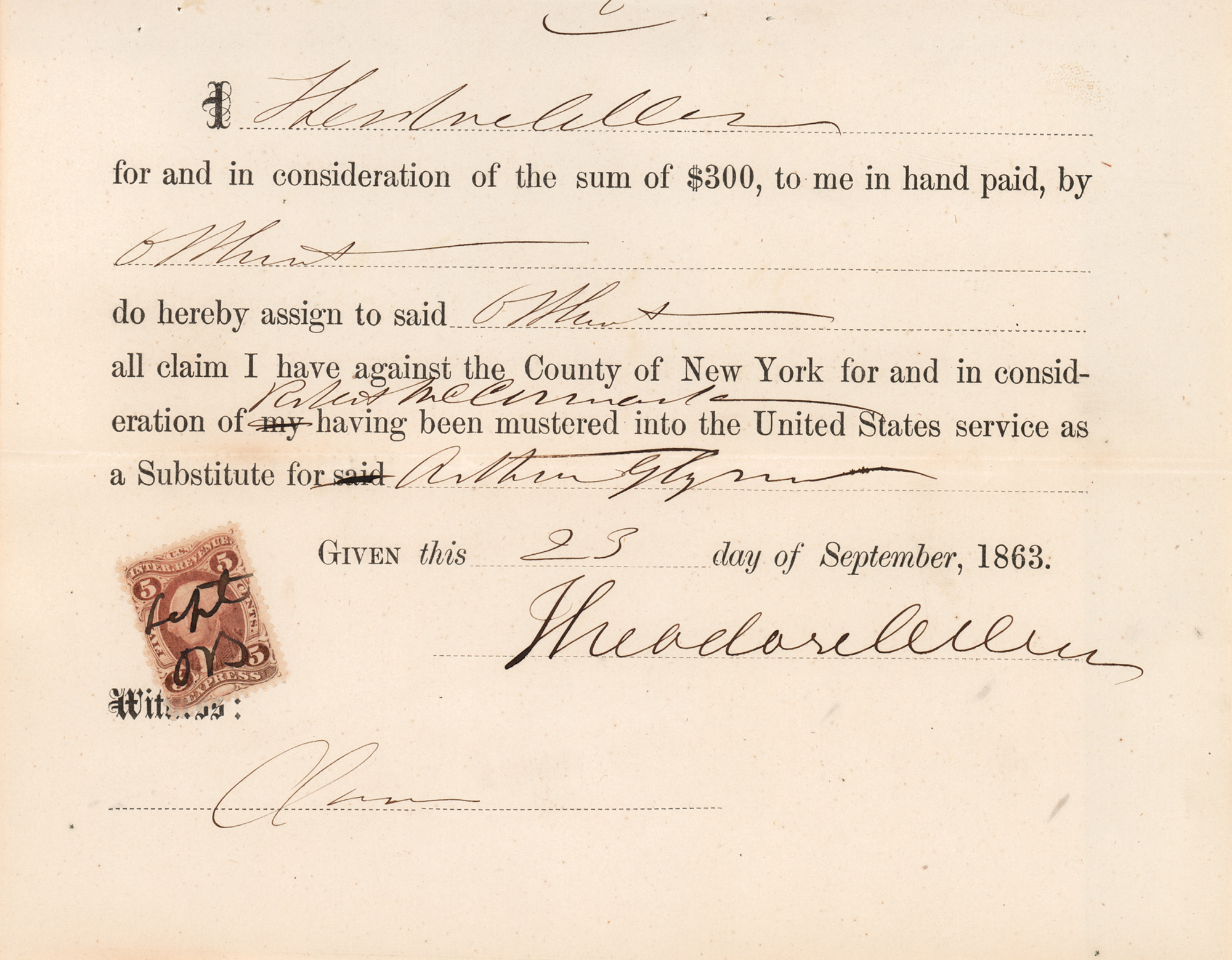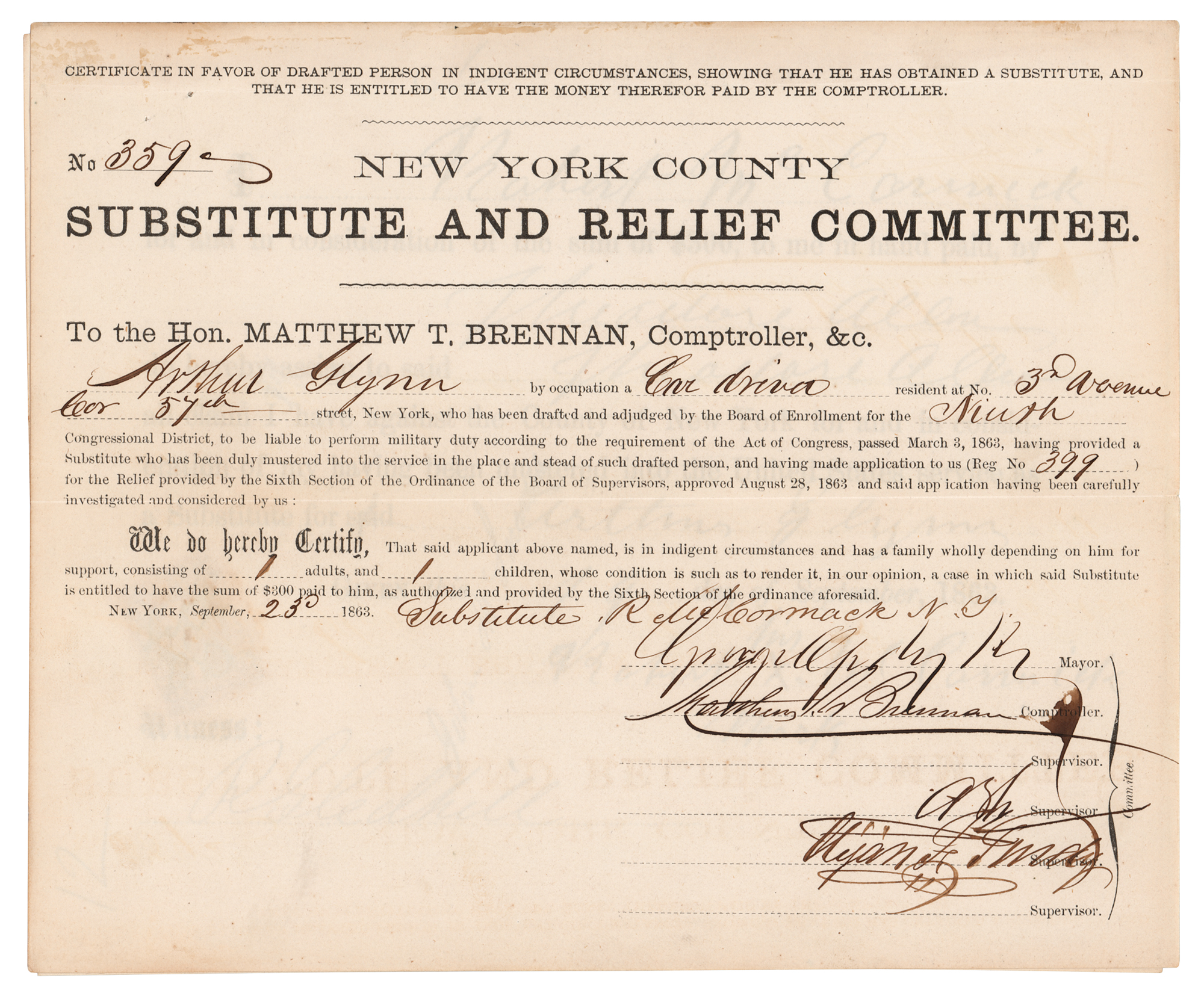 Civil War-dated partly-printed document, three pages, 8.5 x 7, September 23, 1863. Document issued by the "New York County Substitute and Relief Committee," being a "Certificate in favor of Drafted Member in Indigent Circumstances, showing that he has obtained a Substitute and that he is entitled to have the Money therefore paid by the Comptroller." The certificate affirms Robert McCormack as the draft substitute for Arthur Glynn, who is “in indigent circumstances and has a family wholly depending on him for support.” Signed at the conclusion by Mayor George Opdyke, Comptroller Matthew Brennan, and two supervisors. In fine condition.