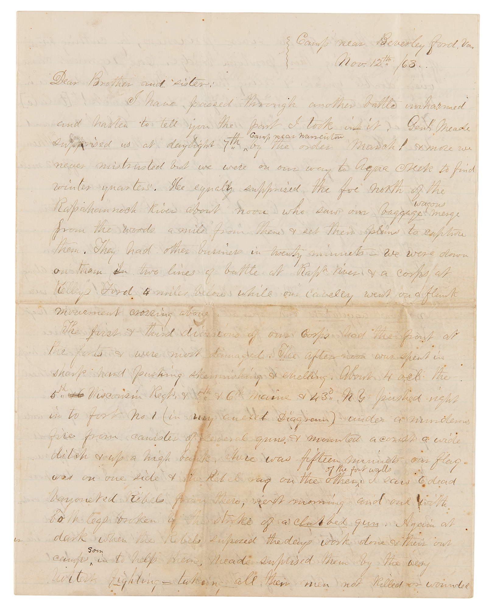 Civil War-dated ALS from Union soldier Thomas Jefferson Burnham of Vermont, signed “Bro. Jefferson,” eight pages, 7.25 x 9.25, November 12, 1863. Addressed from “Camp near Beverly Ford, Va.,” a lengthy handwritten letter to “Brother and Sister,” Benjamin Franklin Burnham and his wife, detailing events of the Second Battle of Rappahannock Station. In part (spelling and grammar retained): “I have passed through another battle unharmed and hasten to tell you the part it took in it. Gen Meade surprised us at day break 7th (Camp near Warrenton) by the order March! and more we never mistrusted but we were on our way to Aqua Creek to find winter quarters. He equally surprised the foe north of the Rappahannock River about noon who saw our baggage wagons merge from the woods a mile from them & set their plans to capture them. They had other business in twenty minutes. We were down on them in two lines of battle at the Rappahannock River & a Corps at kelly's Ford 4 miles below while our Cavelry went on a flank movement crossing above.