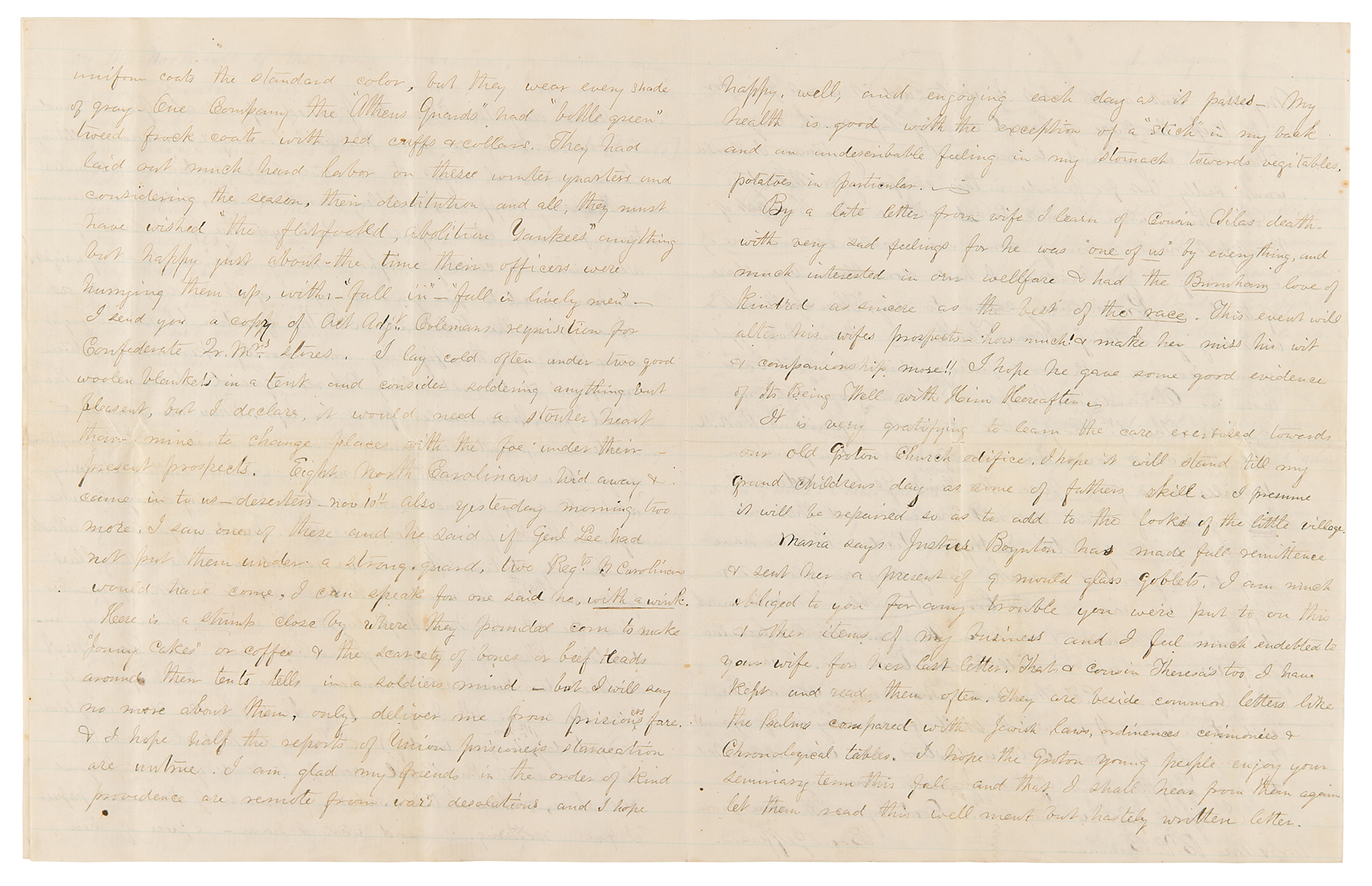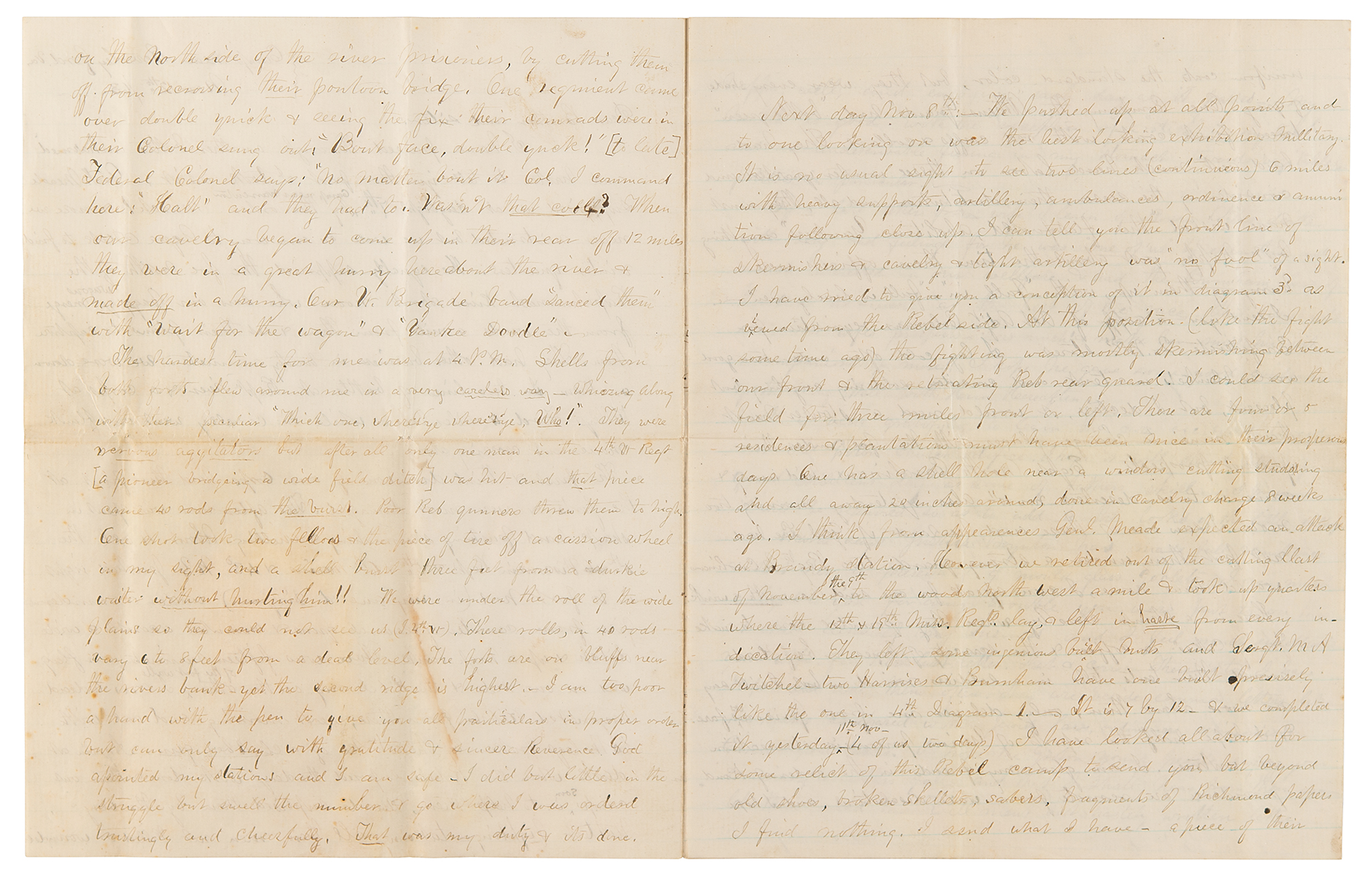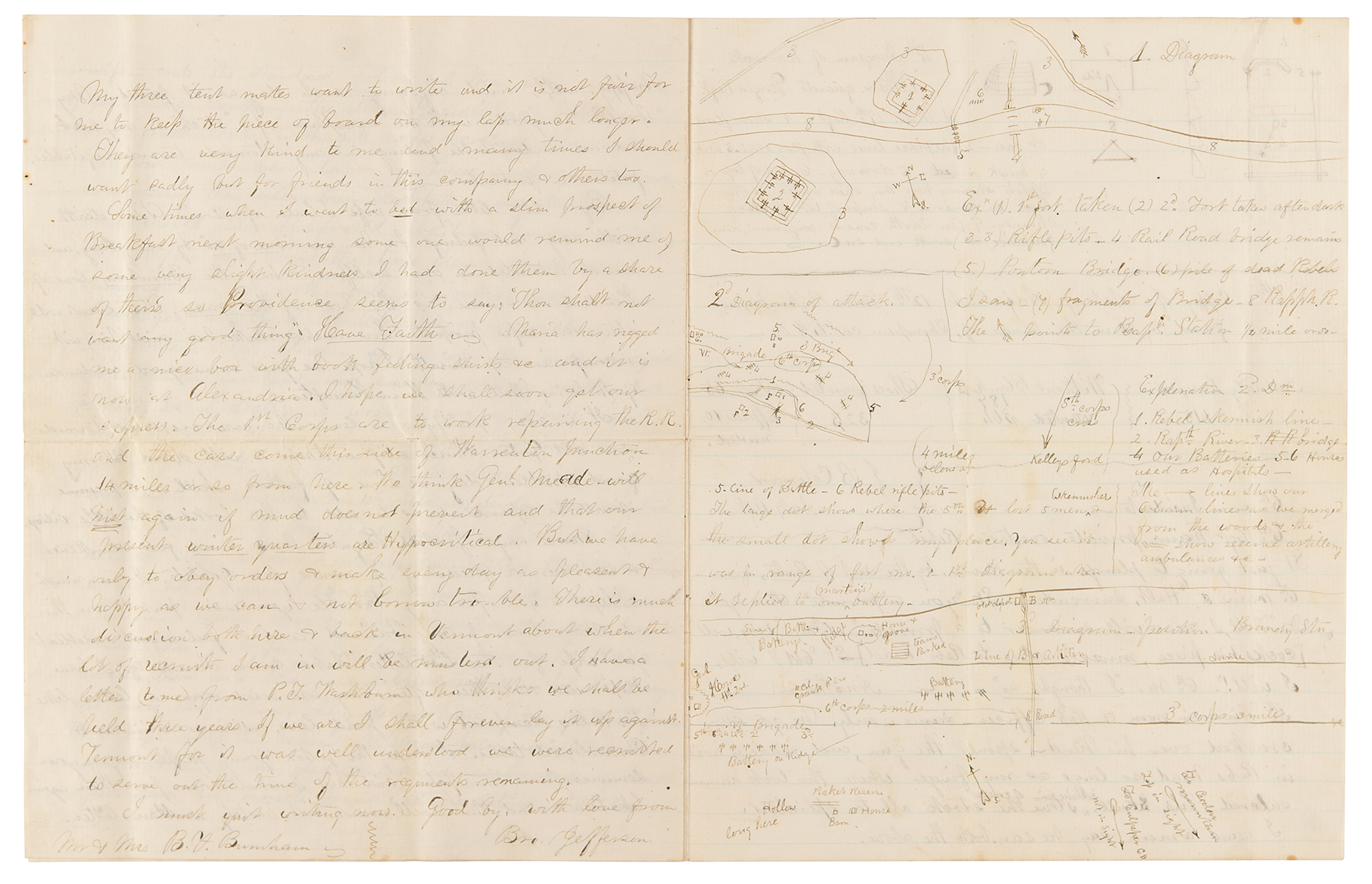 My three tent mates want to write and it's not fair for me to keep the piece of board on my lap much longer. They are very kind to me and many times I should want sadly but for friends in this company & others too. Sometimes when I went to bed with a slim prospect of breakfast next morning someone would remind me of a very slight kindness I had done them by a share of theirs so Providence seems to say ‘Thou shalt not want any good thing.’ Have Faith, Nana has rigged me a nice box with boots….shirts and it is now at Alexandria. I hope we shall soon get in our express. The 1st corps are to work repairing the RR and the cars come this side of Warrenton Junction 14 miles or so from here. We think Genl Meade will…again if mud does not prevent and that our present winter quarters are Hypocritical But we only have to obey orders & make every day as Pleasant & happy as we can & not borrow trouble. There is much discussion both here & back in Vermont about when the lot of recruits I am in will be mustered out. I have a letter (to me) from P. T. Washburn who thinks we shall be held together three years. If we are I shall forever lay it up against Vermont, for it was well understood we were reenlisted to serve out the time of the regiment remaining.” On the seventh and eighth pages, Burnham adds extensive diagrams and details regarding the Union attack, concluding with an amusing section titled “Incidents,” in part: “6th Regt Maine private overtakes Rebel Lt just going to plunge in the river, by the seat of pants, from 6th Maine ‘Halt, surrender’ Lt ‘you a private’ 6th M, ‘yes’ Lt ‘Well, I never will surrender to a private’ 6th M ‘Very Well’ (cocks his piece, muzzle close to Rebs head) Lt ‘Oh! I will, I will! 6th M ‘I thought so.’ Another - 5th Wisconsin man & Reb officer - same - only he got gun cracked over his head the gun…and made a hole in Rebs head as large as my finger where the cock hammer entered his skull, killing him of course, stove the stock all to splinters. I heard a man say he saw both the above.” In fine condition, with a block of light soiling to the first page.