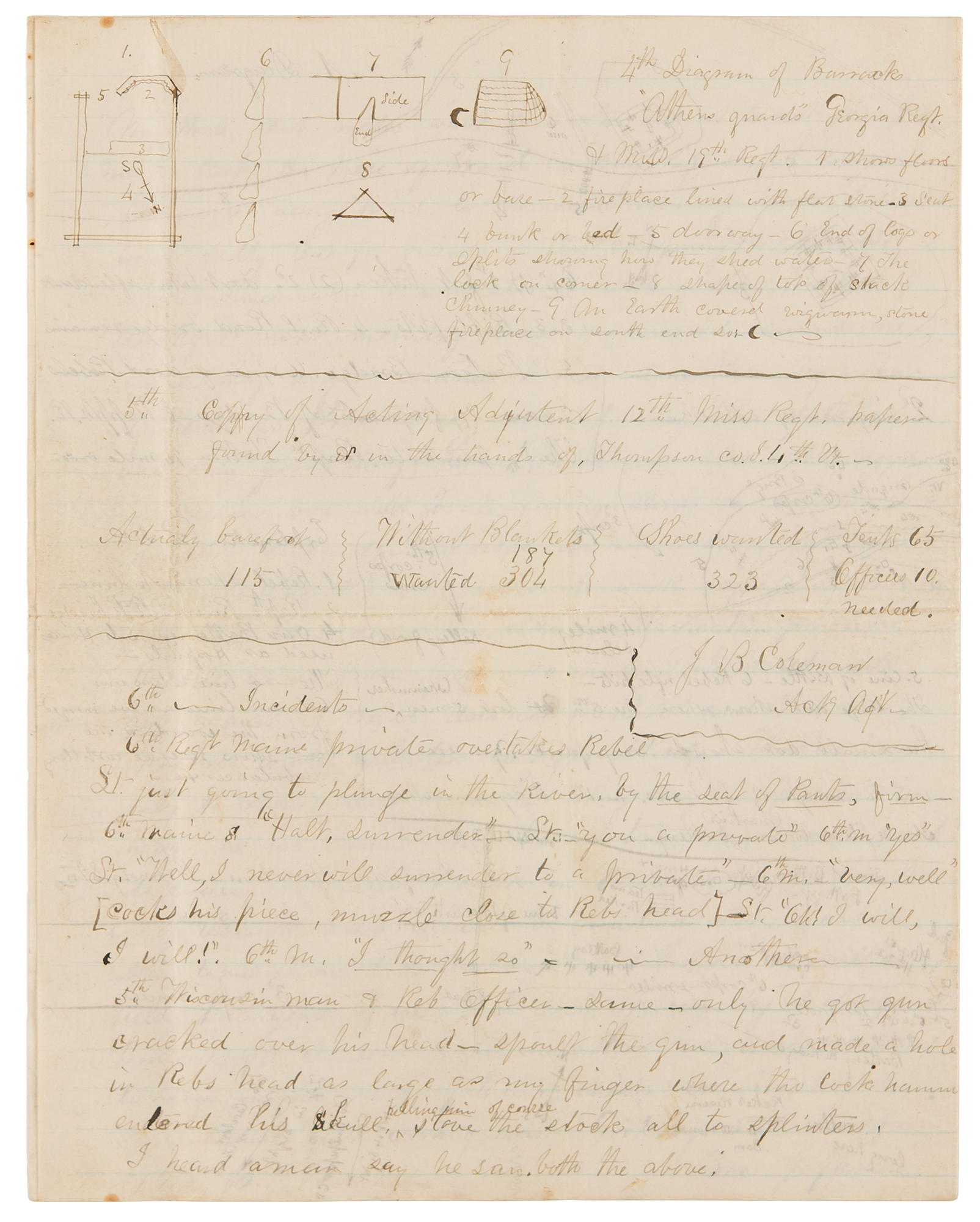 Next day Nov 8th we pushed up at all points and to one looking was the best looking exhibition military. It is no usual sight to see two lines (continuous) 6 miles with heavy support, artillary, ambulances, ordinance & ammo trains following close up. I can tell you the front line of skirmishes & cavelry, & light artillery was ‘no fool’ of a sight. I have tried to give you a conception of it in diagram 3? as viewed from the Rebel side, at this position (like the fight sometime ago) the fighting was mostly skirmishing between our front & the retreating Reb rear guard. I could see the field for three miles front or left. There are four or 5 residences & plantations must have been nice in their prosperous days. One was a shell hole near a window cutting studding and all away 20 inches around, done in Cavelry charge 8 weeks ago. I think from appearances Genl Meade expected an attack at Brandy Station. However we retired out of the…of November the 9th to the woods north west a mile & took up quarters where the 12th & 19th Mass Regts lay, & left in haste. From every indication they left some ingenious built forts and Sergt M. A. Twitchel, two Harrises & Burnham have one built precisely like the one in the diagram 1. It is 7 by 12 & we completed it yesterday 11th Nov - (4 of us two days) 1 have looked all about for some relick of the Rebel camp to send you but beyond old shoes, broken skillets, sabers, fragments of Richmond papers I find nothing. I send what I have - a piece of their uniform coats the standard color, but they wear every shade of grey - One Company the "Athens Guards" had "bottle green" tweed frock coats with red cuffs and collars. They had laid out much hard labor on these quarters and considering the season, their destination and all, they must have wished ‘the flatfooted, abolition Yankees’ anything but happy just about the time their officers were hurrying them up, with, - ‘full in’ - ‘full in lively men’ - I send you a copy of Adjt. Colemans requisition for Confederate…stores. I lay cold often under two good woolen blankets in a tent and consider soldering anything but pleasant, but I declare, it would need a stouter heart than mine to change places with the foe under their present prospects. Eight North carolinians hid away and came in to us - deserters - Nov 10th Also yesterday morning two more. I saw one of these and he said if Genl Lee had not put them under a strong guard, two Regts N Carolinians would have come, I can speak for one said he with a wink. There is a stump nearby where they pounded corn to make ‘Jonny cakes’ or coffee & the scarcety of bones or beef heads around their tents tells in a soldiers mind - but I will say no more about them, only, deliver me from prisoners fare. & I hope half the reports of Union prisoners starvation are untrue. I am glad my friends in the order of kind providence are remote from war's desolations and I hope happy, well, and enjoying each day as it passes My health is good with the exception of a ‘stich’ in my back and an undescribable feeling in my stomach towards vegitables, potatoes in particular.