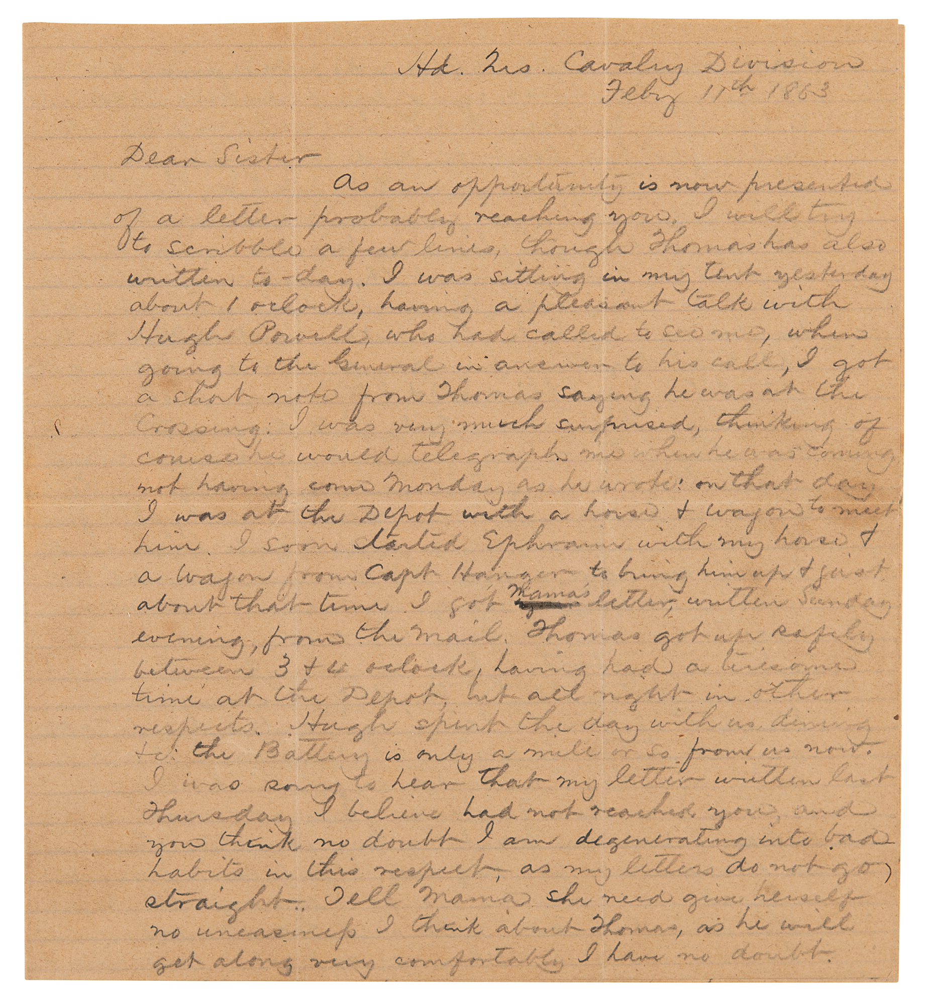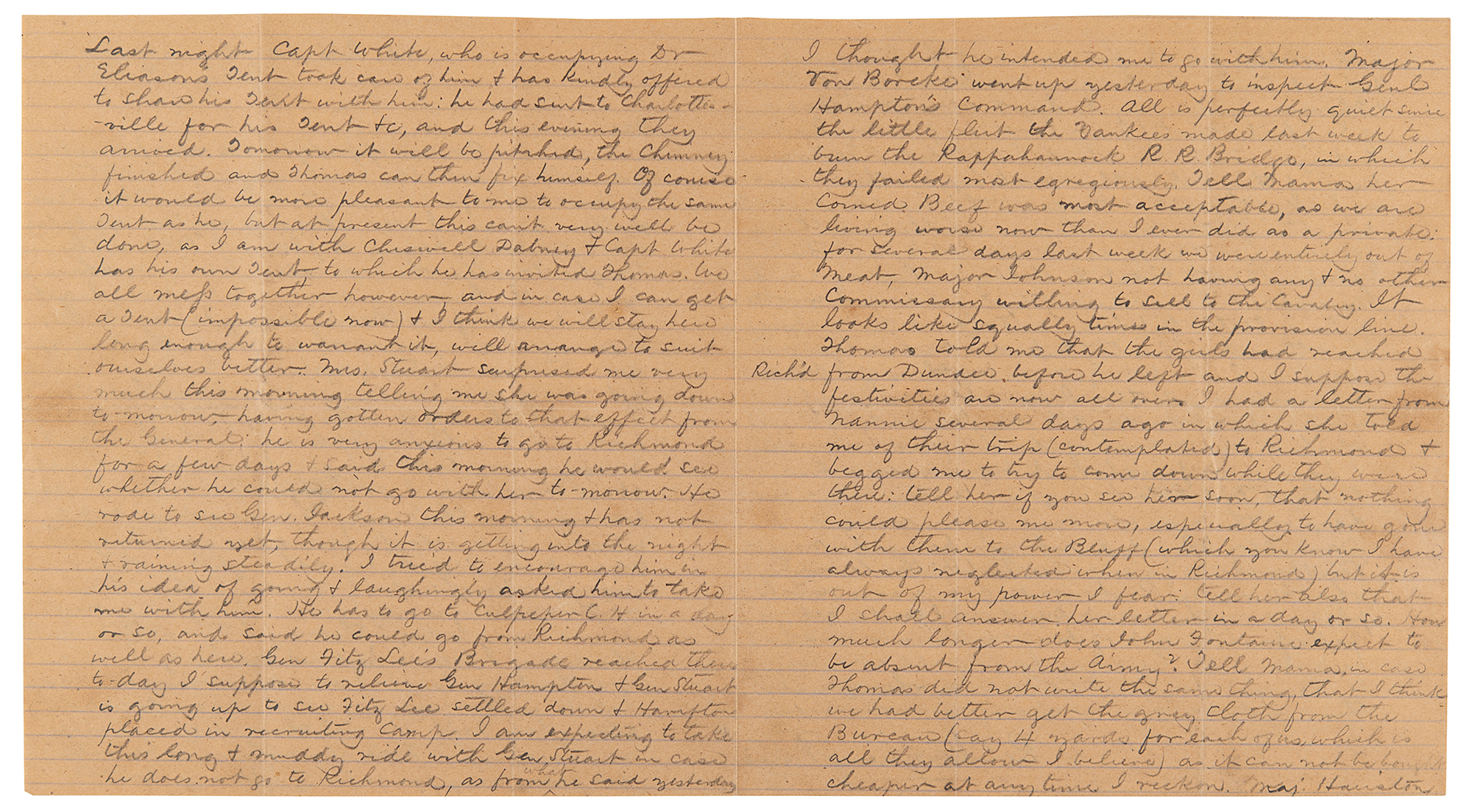 Civil War-dated ALS in pencil from Maj. Richard Channing Price, aide-de-camp to Confederate General J. E. B. Stuart, four pages on two adjoining sheets, 7.5 x 8.25, February 11, 1863, less than three months before he was fatally wounded at Chancellorsville. Addressed from “Hd. Qrs. Cavalry Division,” a lengthy handwritten letter to his sister, in part: “As an opportunity is now presented of a letter probably reaching you. I will try to scribble a few lines, though Thomas has also written today. I was sitting in my tent yesterday about 1 o’clock having a pleasant talk with Hugh Powell, who had called to see me, when going to the General [Stuart] in answer to his call, I got a short note from Thomas saying he was at the crossing I was very much surprised, thinking of course he would telegraph me when he was coming not having come Monday as he wrote on that day I was at the Depot with a horse & wagon to meet him. I soon started Ephraim [his servant] with my horse & wagon from Capt Hanger to bring him up & just about that time I got Mama's letter, written Sunday evening from the mail. Thomas got up safely between 3 & 4 o'clock having had a tiresome time at the Depot, but all right in other respects. Hugh spent the day with us dining, etc. the Battery is only a mile or so from us now. I was sorry to hear that my letter written last Thursday I believe had not reached you, and you think no doubt I am degenerating into bad habits is this respect as my letters do not go straight. Tell Mama she need give herself no uneasiness I think about Thomas, as he will get along very comfortably I have no doubt.