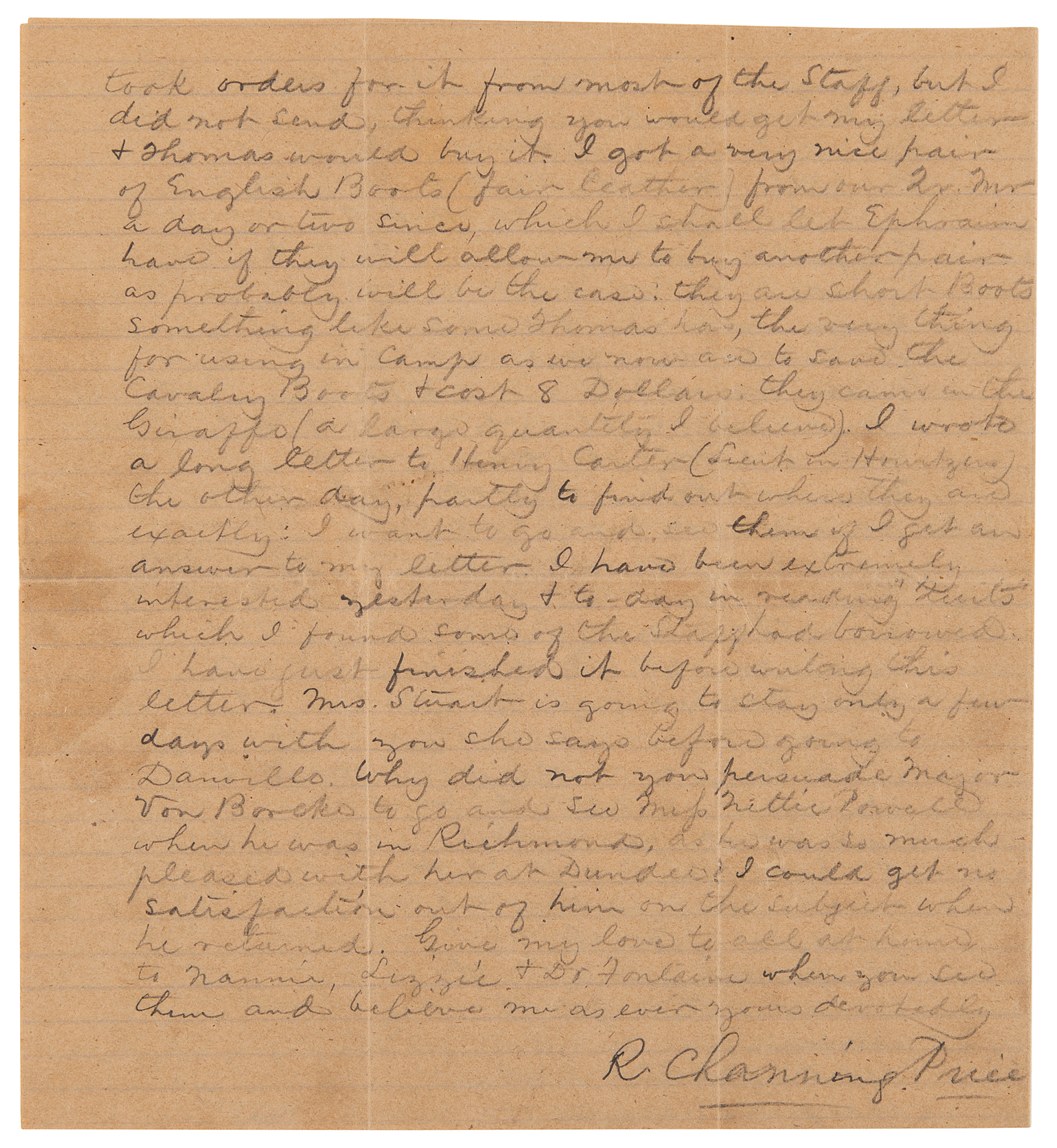 Confederate Soldier's Letter: Richard Channing Price, Aide-de-Camp to General J. E. B. Stuart