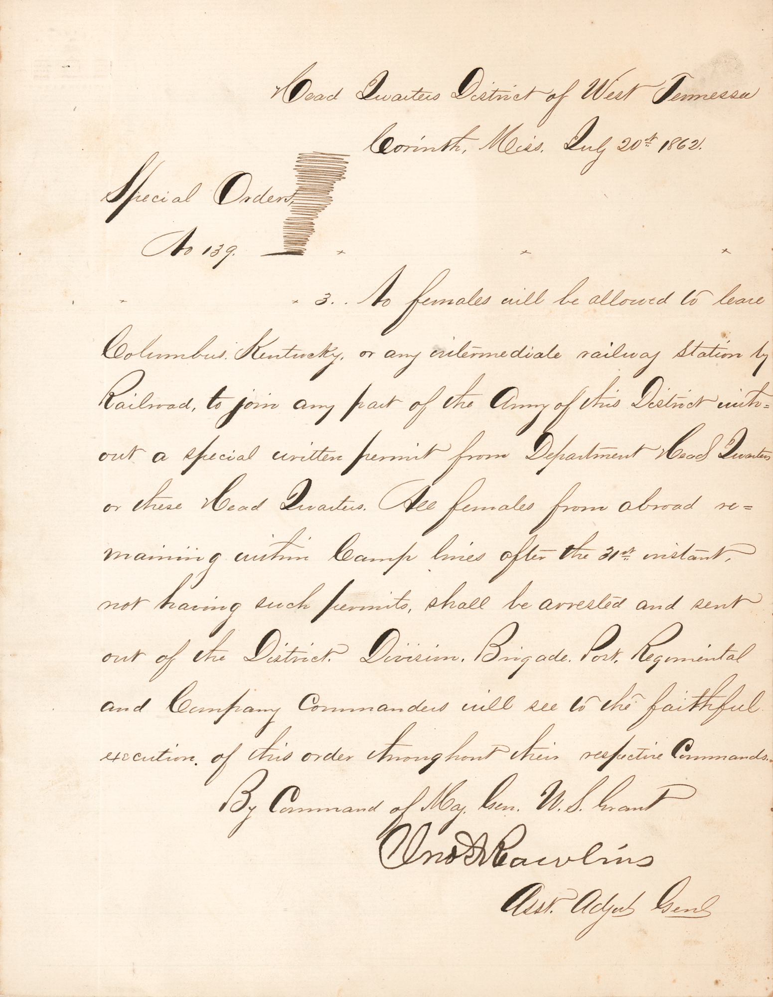 Union general (1831–1869) who served as Grant's aide-de-camp and later as a brigadier general. A close friend and confidant of Grant, Rawlins was appointed secretary of war at the start of his presidency. Civil War-dated manuscript DS signed “Jno. A. Rawlins,” one page, 7.75 x 10, July 20, 1862. Sent from “Head Quarters District of West Tennessee,” special order No. 139, which bans the travel of unauthorized women from northern rail points to the army's encampments, along with their presence in camp. In full: “No females will be allowed to leave Columbus, Kentucky, or any intermediate railway Station by Railroad, to join any part of the Army of this District without a special written permit from Department Head Quarters or these Head Quarters. All females from abroad remaining within Camp lines shall be arrested and sent out of the District. Division, Brigade, Post, Regimental and Company Commanders will see to the faithful execution of this order throughout their respective Commands.” Signed at the conclusion by John A. Rawlins as Assistant Adjutant General, “By Command of Maj. Gen. U. S. Grant.” In fine condition.