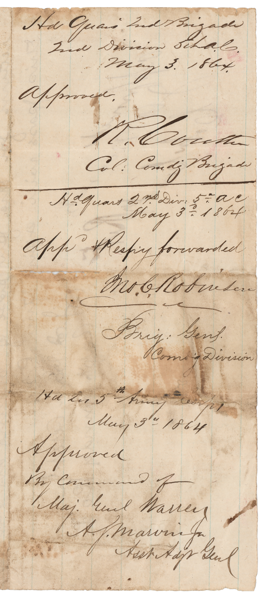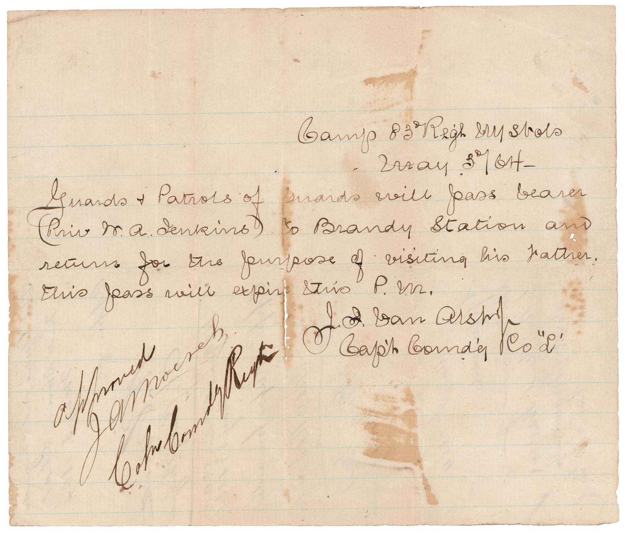 Civil War-dated manuscript document, one page, 7.75 x 6.75, May 3, 1864. Addressed from “Camp 83rd Regt. N.Y.S. Vols.,” a pass from Captain John J. Van Alst, Jr., directing “Guards & Patrols of Guards will pass bearer (Priv. W. A. Jenkins) to Brandy Station and return for the purpose of visiting his Father. This pass will expire this P. M.” Signed below by Van Alst and countersigned by Joseph A. Moesch, “Coln. Comdg. Regt." The reverse bears endorsements from Union officers John C. Robinson (“Jno. C. Robinson, Brig. Genl. Comd’g Division”), Richard Coulter (“R. Coulter, Col. Comdg. Brigade”), and A.J. Marvin, Jr., “By Command of Maj. Genl. [Gouverneur K.] Warren.” In very good to fine condition, with scattered staining.