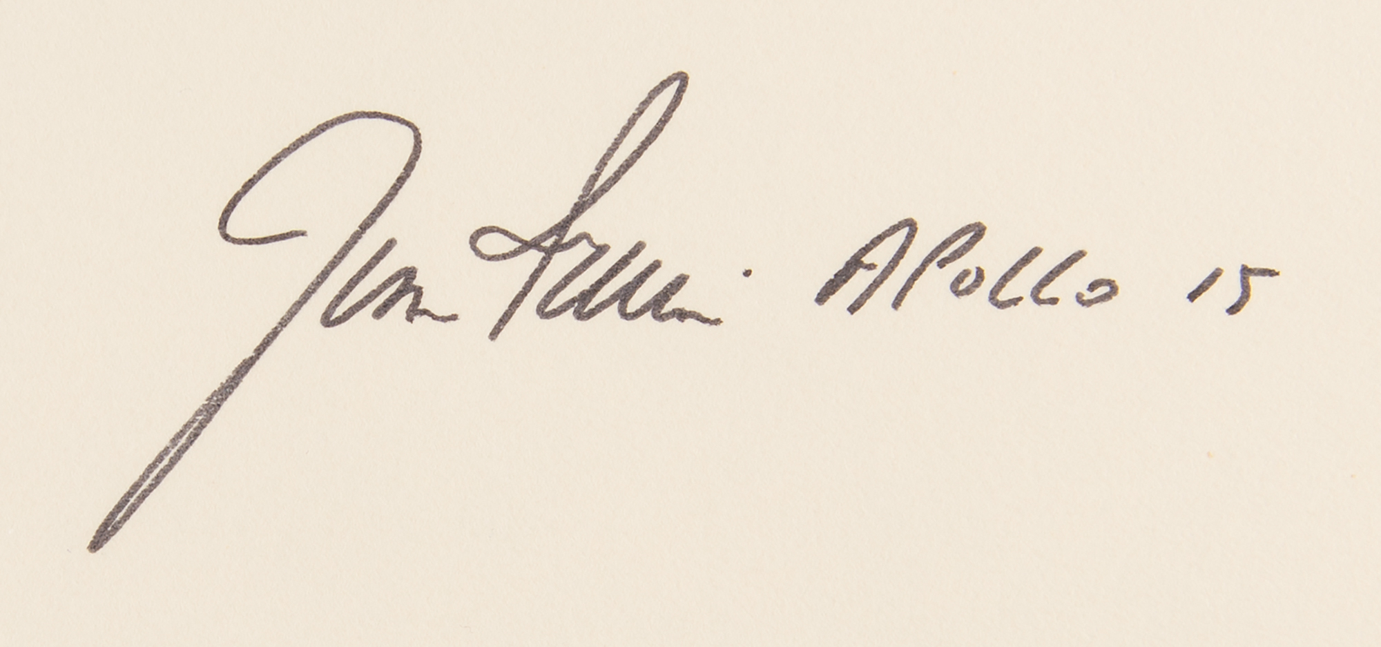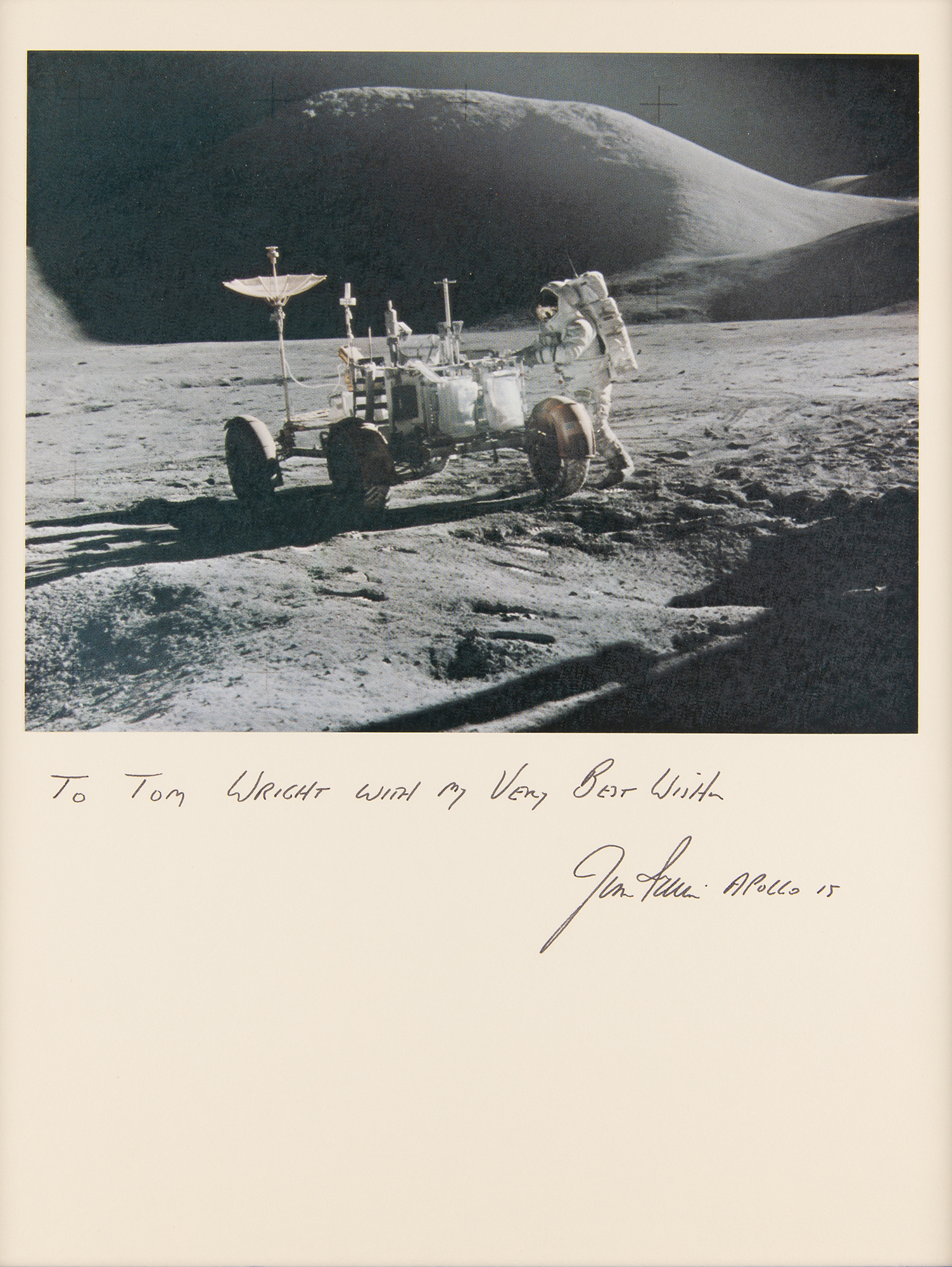 Matte-finish 9.5 x 7.25 photo of Jim Irwin with Lunar Roving Vehicle during an Apollo 15 EVA, with Mount Hadley in the background, affixed to a 10.5 x 13.5 mount, signed and inscribed on the mount in black felt tip, "To Tom Wright, with my very best wishes, Jim Irwin, Apollo 15.” Framed to an overall size of 12 x 15.25. In fine condition.