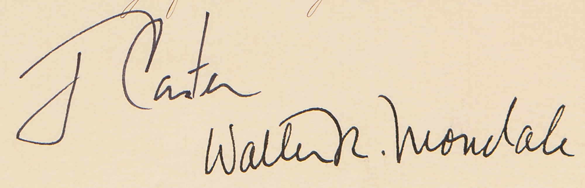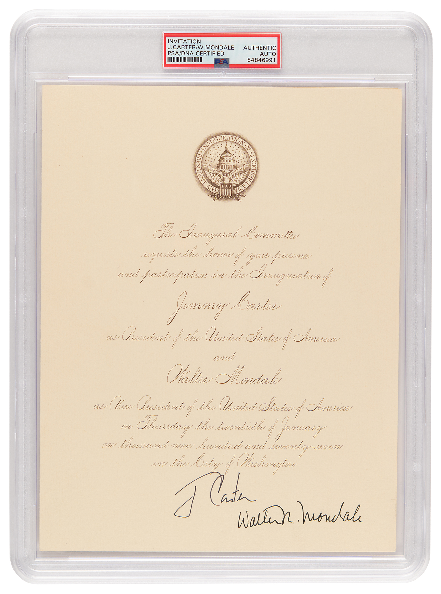 Printed invitation for the inauguration of President Jimmy Carter and Vice President Walter Mondale on January 20, 1977, one page, 8.25 x 10.75, signed at the bottom in black ink by both men: “J. Carter” and “Walter F. Mondale.” In very fine condition. Encapsulated in a PSA/DNA authentication holder.
