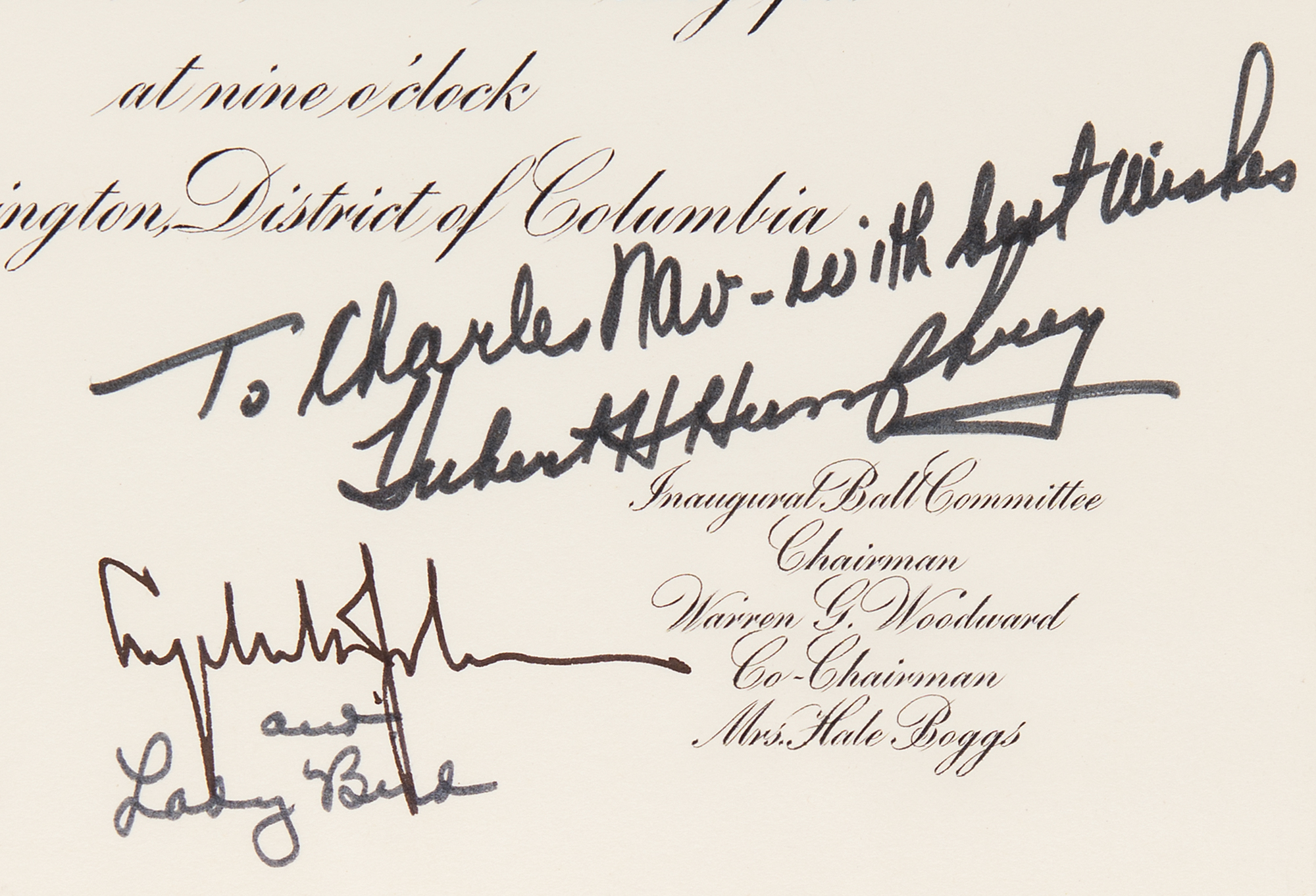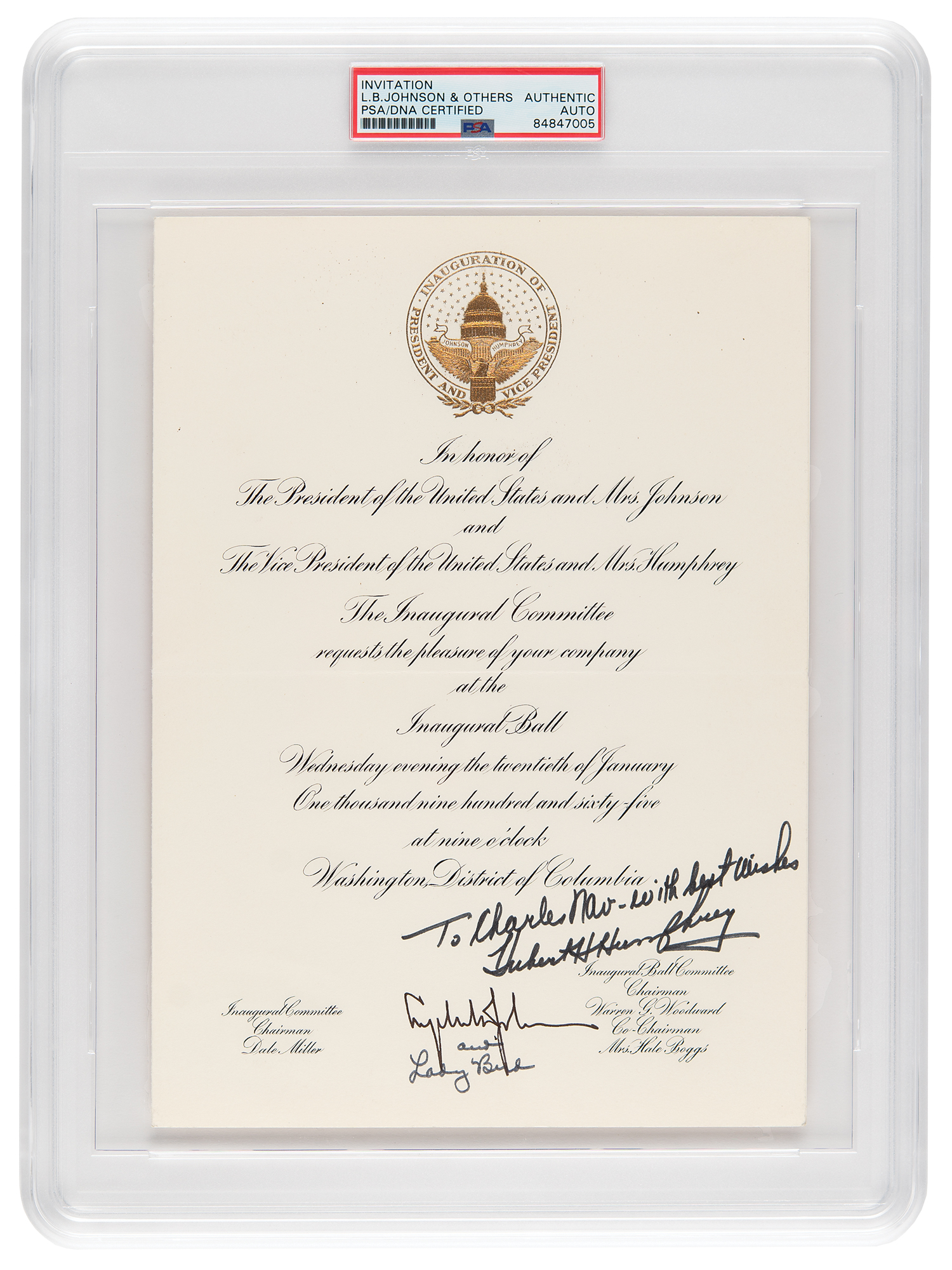 Desirable official invitation to the Inaugural Ball honoring President Johnson and Vice President Humphrey on January 20, 1965, one page, 7 x 9.5, signed and inscribed at the bottom in black ink, "Lyndon B. Johnson," "and Lady Bird," and "To Charles Nav — with best wishes, Hubert H. Humphrey." In fine condition, with a central horizontal fold. Encapsulated in a PSA/DNA authentication holder.