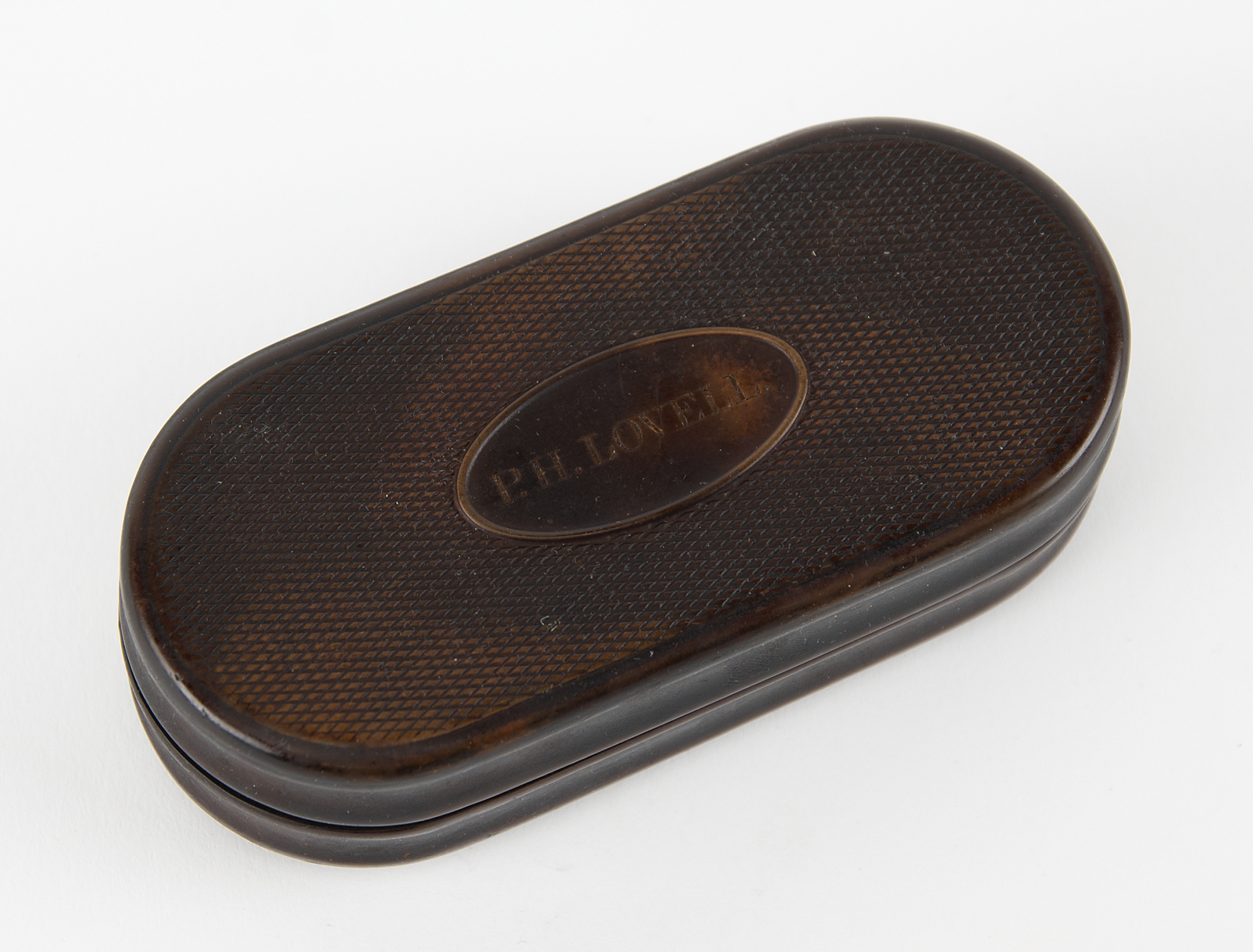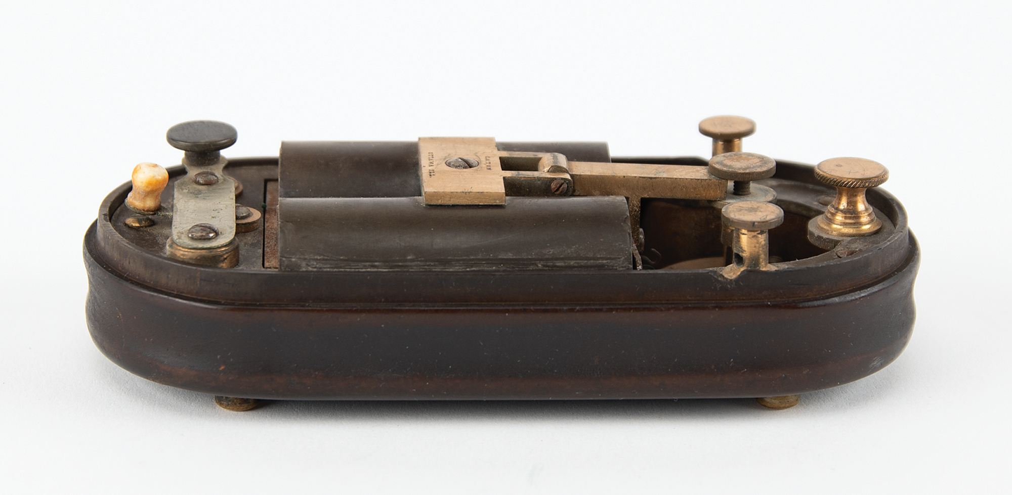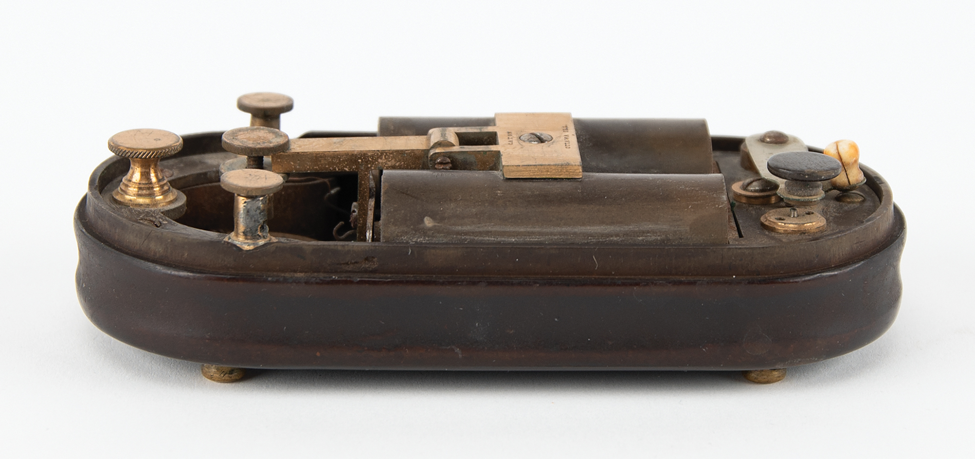 Rare circa 1860s Caton lineman's pocket telegraph set, as used by spies during the Civil War. Measuring just 5″ x 2.25″ x 1.25″ in its hard rubber case (engraved "P. H. Lovell" on the lid), this is a complete ultra-portable telegraph sending and receiving system. During the Civil War, telegraph operator spies used these to tap into the enemy's communications systems: a bare wire tossed over uninsulated telegraph lines—and grounded with a bayonet—allowed them to intercept messages or send along false intelligence. This diminutive unit features horizontally mounted sounder coils, a 1.5″ strap telegraph key, and a tiny shorting switch. The center piece is engraved with the maker's name, "Caton, Ottawa, Ill." In fine condition. These were also known as a pocket telegraph machine, cavalryman's portable telegraph key, or Caton Pocket Relay. At the time of their use, the Caton was the highest quality machine on the market.
