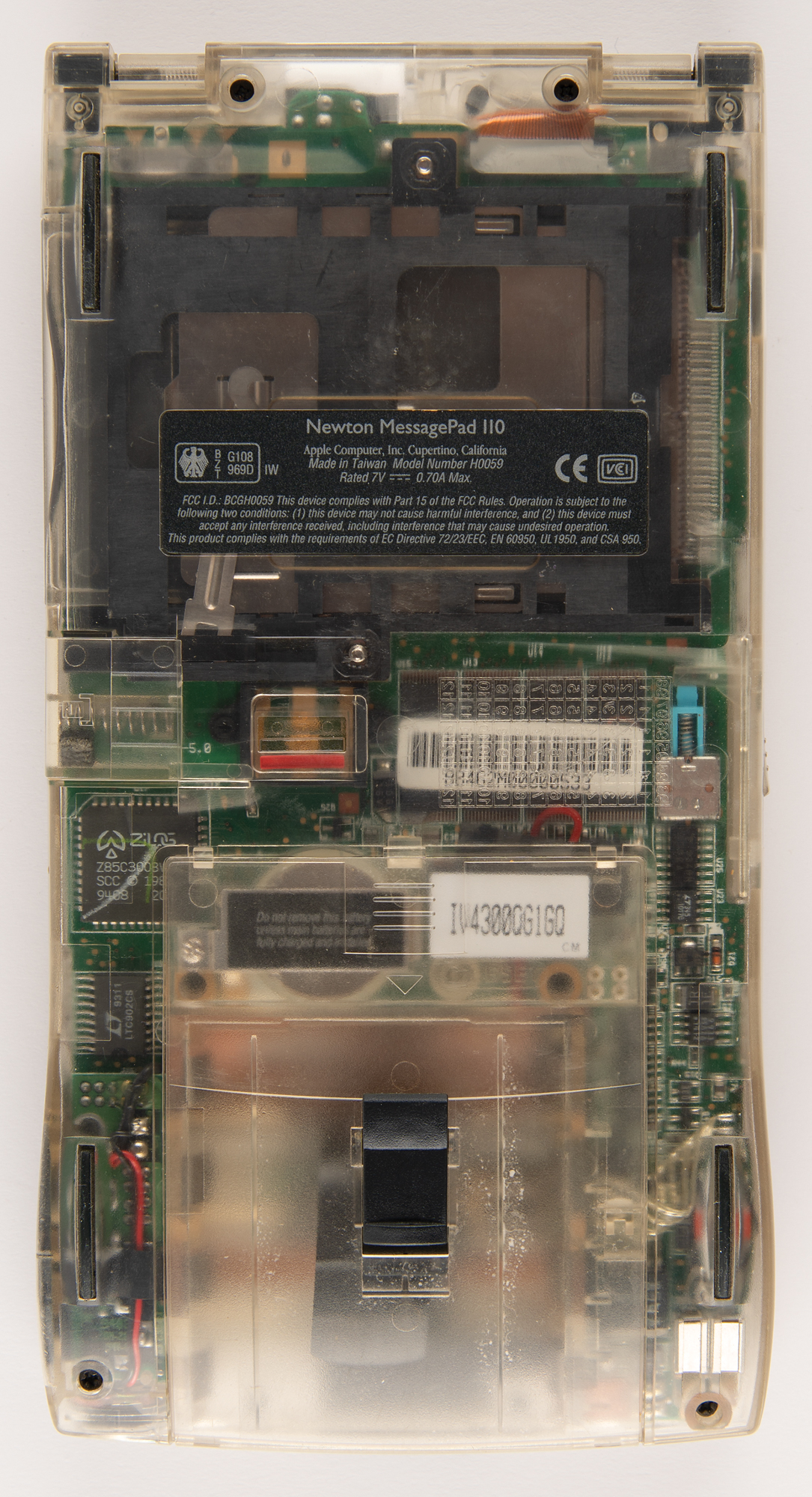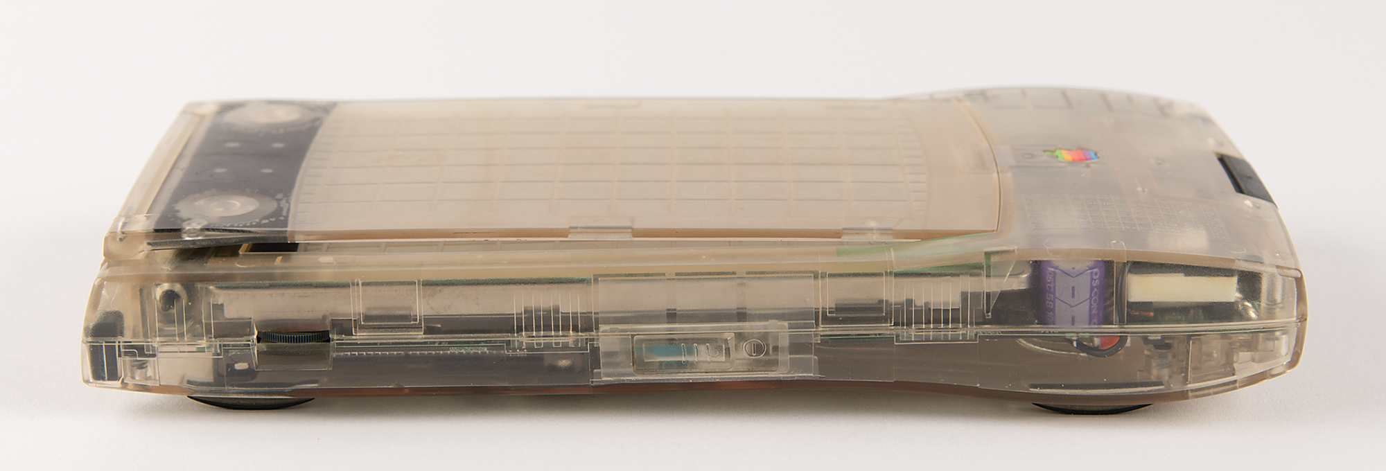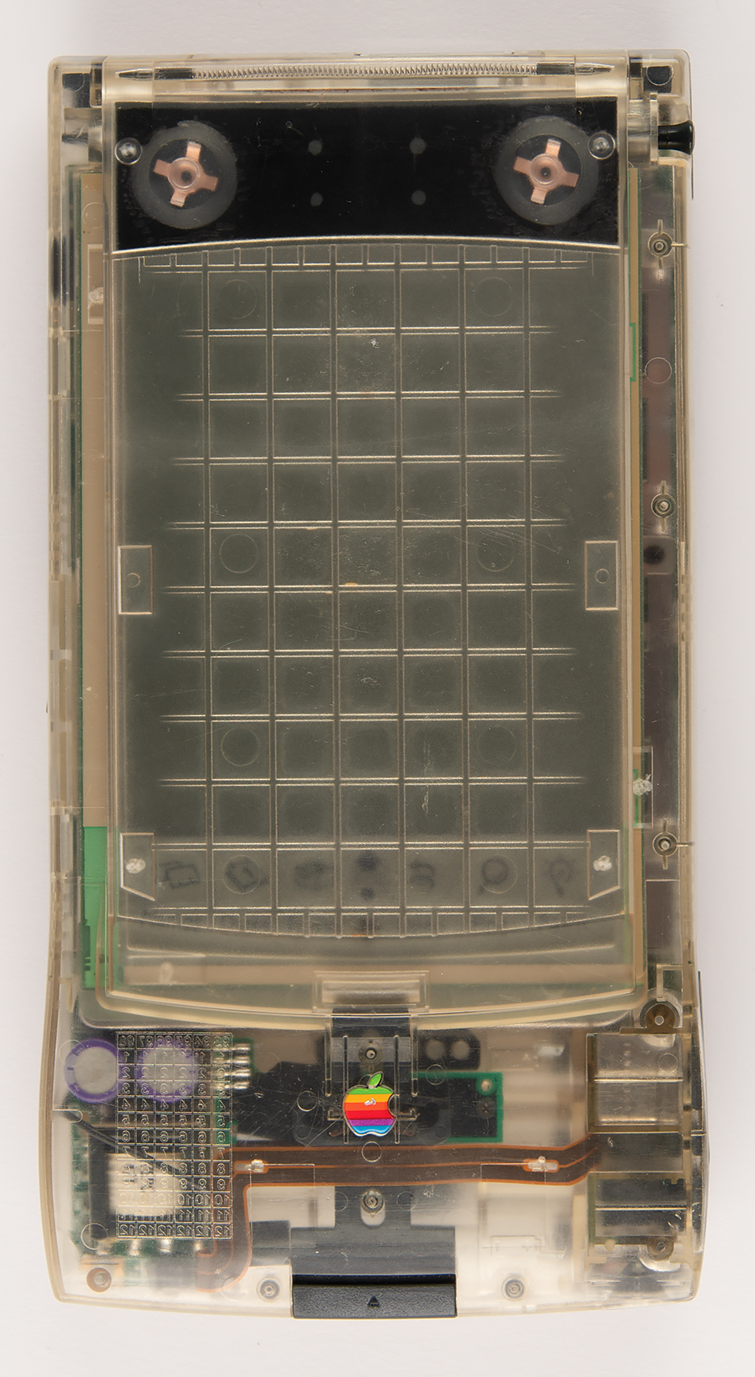 This clear edition of the Apple Newton MessagePad 110 was given to Apple developers at a conference in 1994. Purportedly, two versions of the clear MessagePad 110s were distributed: one had a ‘quick tips’ label affixed to the inside of the translucent cover, and the other version had a grid of rectangular shapes molded into the cover, a distinction present to this offered version. Per Maurice Sharp, a DTS Engineer at Apple, there were ‘a few different types of clear 110's produced (in fact of any device),’ which consisted of DVT, PVT, and ‘pre-prod/concept’ versions. It’s believed that less than 400 of these clear MessagePad 110s were produced.