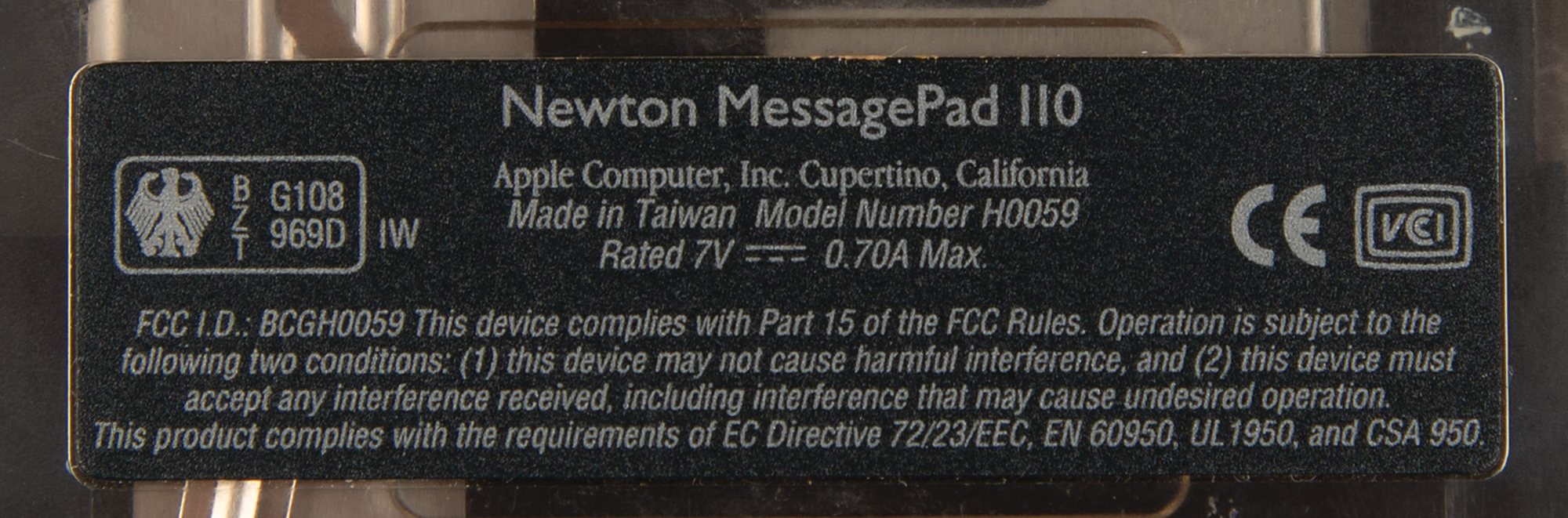 Sought-after ‘clear’ version of the Apple Newton MessagePad 110, Part No. H0141LL/A, Serial No. IV4300QG1GQ, complete with its original box. The box includes the ‘clear’ Newton MessagePad 110 with pen, Newton MessagePad 110 Handbook, NewtonMail booklet, Newton VHS tape, Newton and Apple stickers, and other related brochures. The device is tested to be in working condition; the box is fine condition, with slight wear and a few short tears. Released in March 1994, the MessagePad 110 features a 20 MHz ARM 610 processor, 4 MB of ROM, 1.0 MB of SRAM (480k usable), and innovative infrared-beaming messaging capabilities.