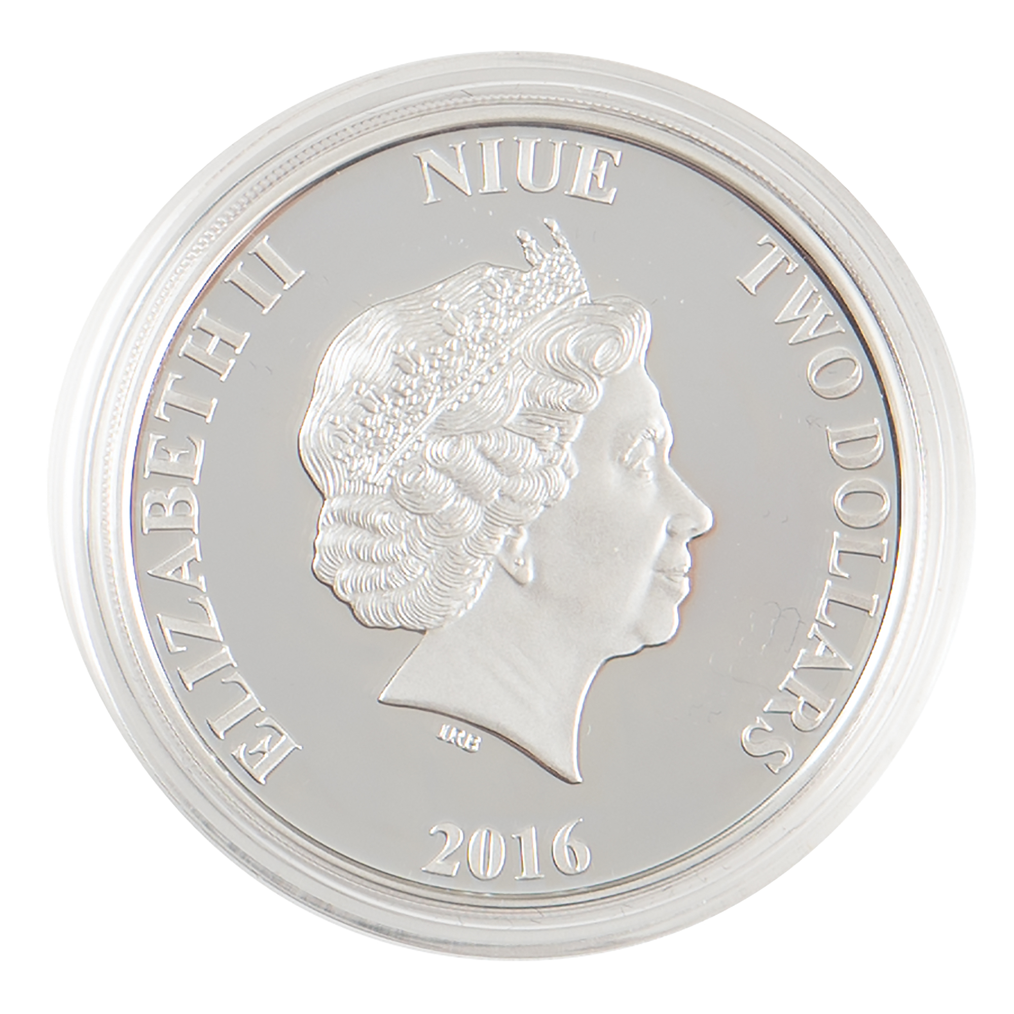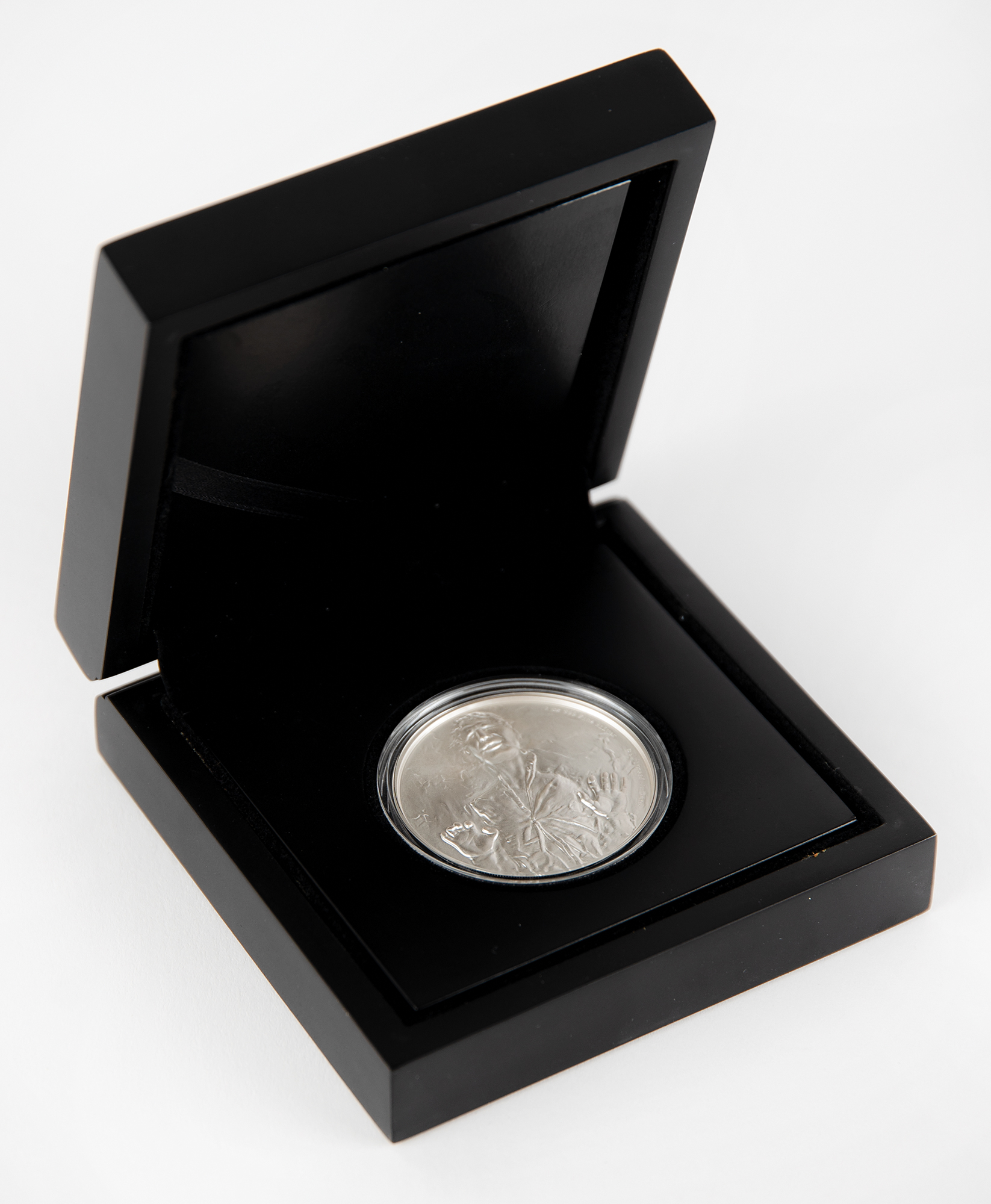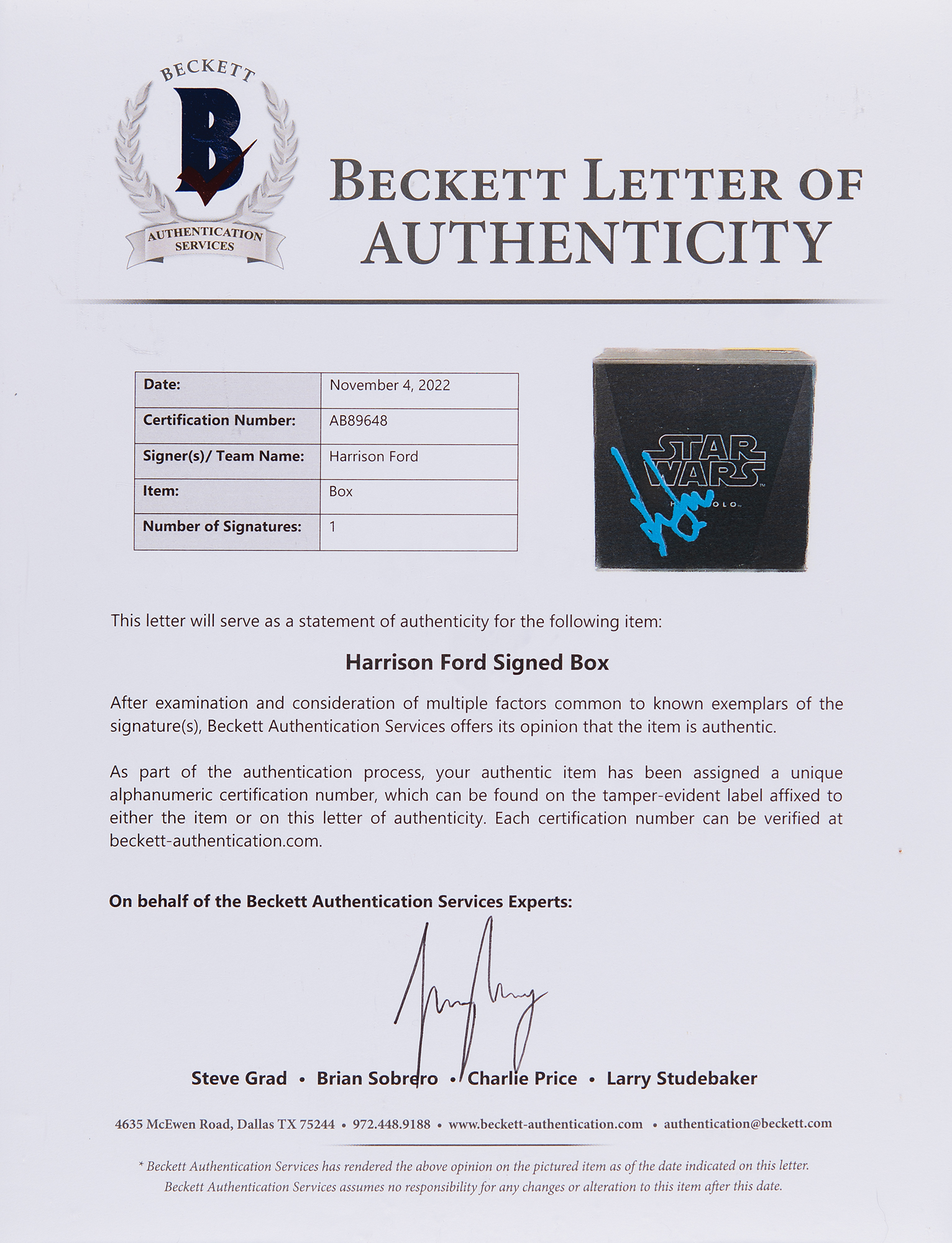 Limited edition Star Wars coin box, 4" x 4" x 1", signed on top of the cover in blue paint pen by Harrison Ford. The box contains a wooden case bearing the Resistance symbol, holding a 2016 limited edition 1-ounce silver coin issued by the New Zealand Mint as legal tender, under the authority of Niue. The front of the coin shows a profile image of Queen Elizabeth II, and the reverse bears the image of Han Solo frozen in carbonite as seen in the second Star Wars film The Empire Strikes Back. Accompanying the coin is a small pamphlet with the coin's specifications. In very fine condition, with a Beckett authentication label affixed to the side of the cardboard box. Accompanied by a full letter of authenticity from Beckett Authentication Services.