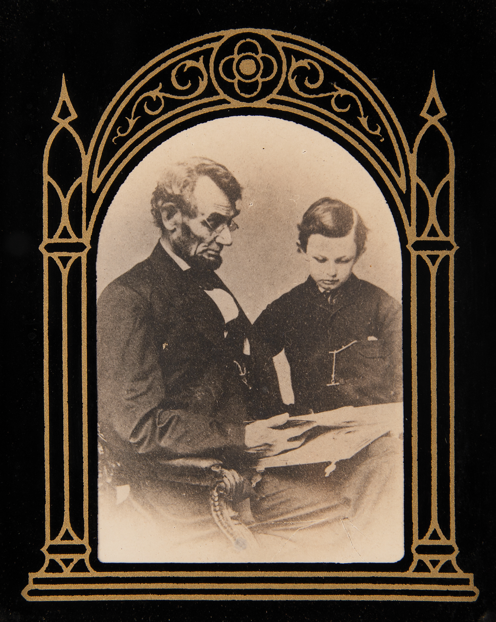 In this image, Lincoln holds 'a big photograph album which the photographer, posing the father and son, had hit upon as a good device to use in this way to bring the two sitters together.' Lincoln later feared that the public would view this pose as 'a species of false pretense' because most viewers would assume the book was a large clasped Bible. When they learned that it was a photograph album, they might think Lincoln was 'making believe read the Bible to Tad.' Just as Lincoln feared, after his death some versions were carefully retouched in order to make the album appear to be a large Bible.