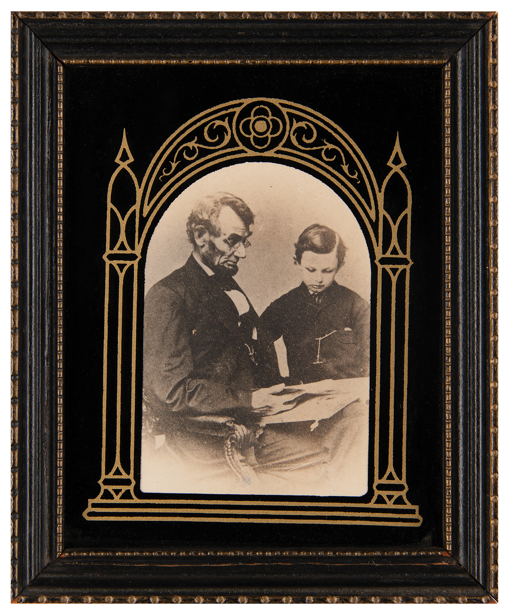 Matte-finish 2.25 x 3.25 carte-de-visite–style photograph of Abraham Lincoln with his son, Tad, originally taken at Mathew Brady's studio by his assistant, Anthony Berger, on February 9, 1864. Displayed in a 4.75 x 5.75 frame. In fine condition.
