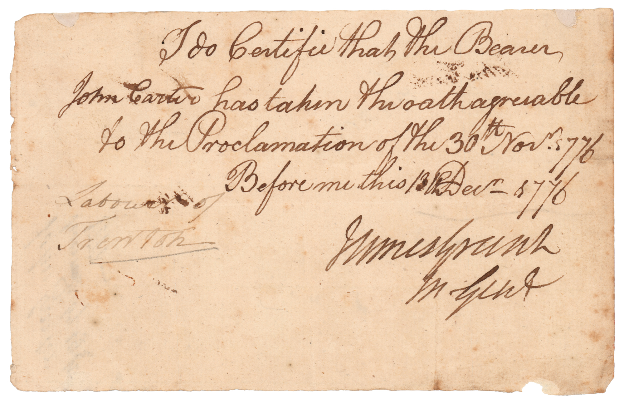 British Army officer (1720–1806) who served as a major general during the American War of Independence; he had also served as the colonial governor of British East Florida from 1764 to 1771. Revolutionary War–dated manuscript DS, signed “James Grant, M. Genl.,” one page, 6 x 3.75, December 13, 1776. Manuscript loyalty oath certificate, in full: "I do certifie that the John Carter has taken the oath agreeable to the Proclamation of the 30th Nov'r 1776." In fine condition.