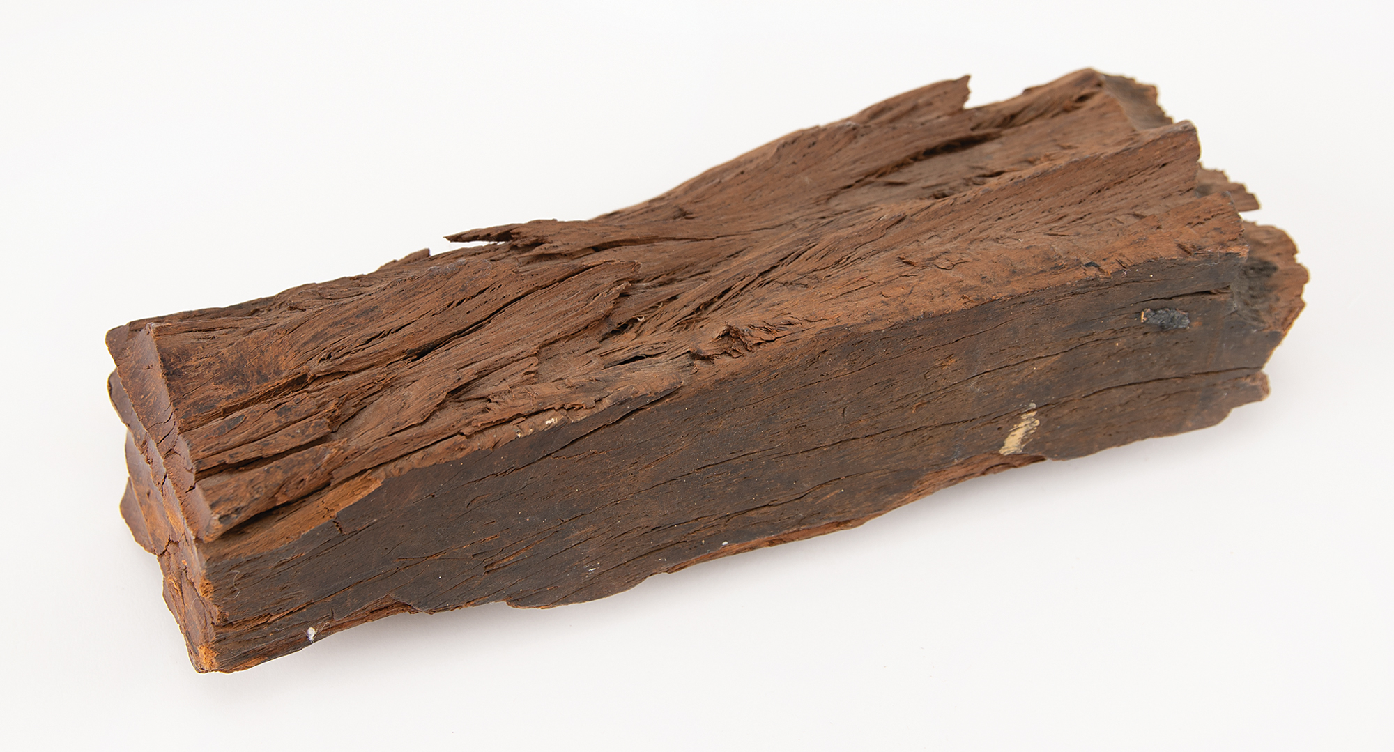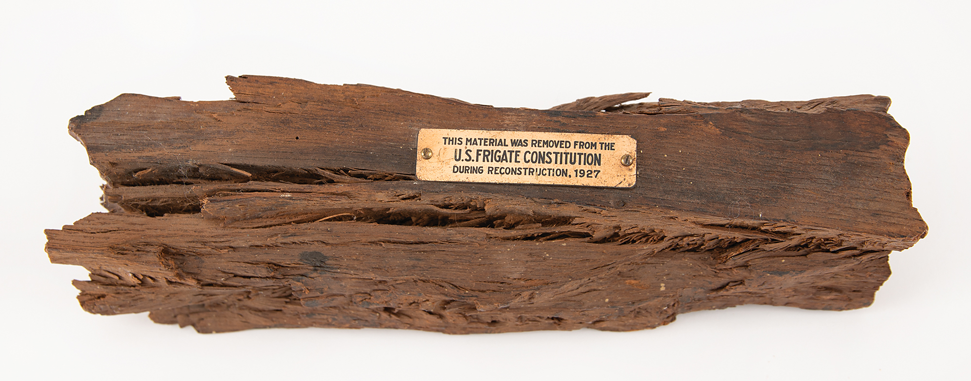 Large block of wood removed from the USS Constitution during the frigate's historic 1927 restoration, measuring 12.25˝ x 2.5˝ x 3.5˝, with an attached metal plate reading: "This material was removed from the U.S. Frigate Constitution during reconstruction, 1927." In very good to fine condition. A fantastic artifact from 'Old Ironsides,' much larger than typically seen.