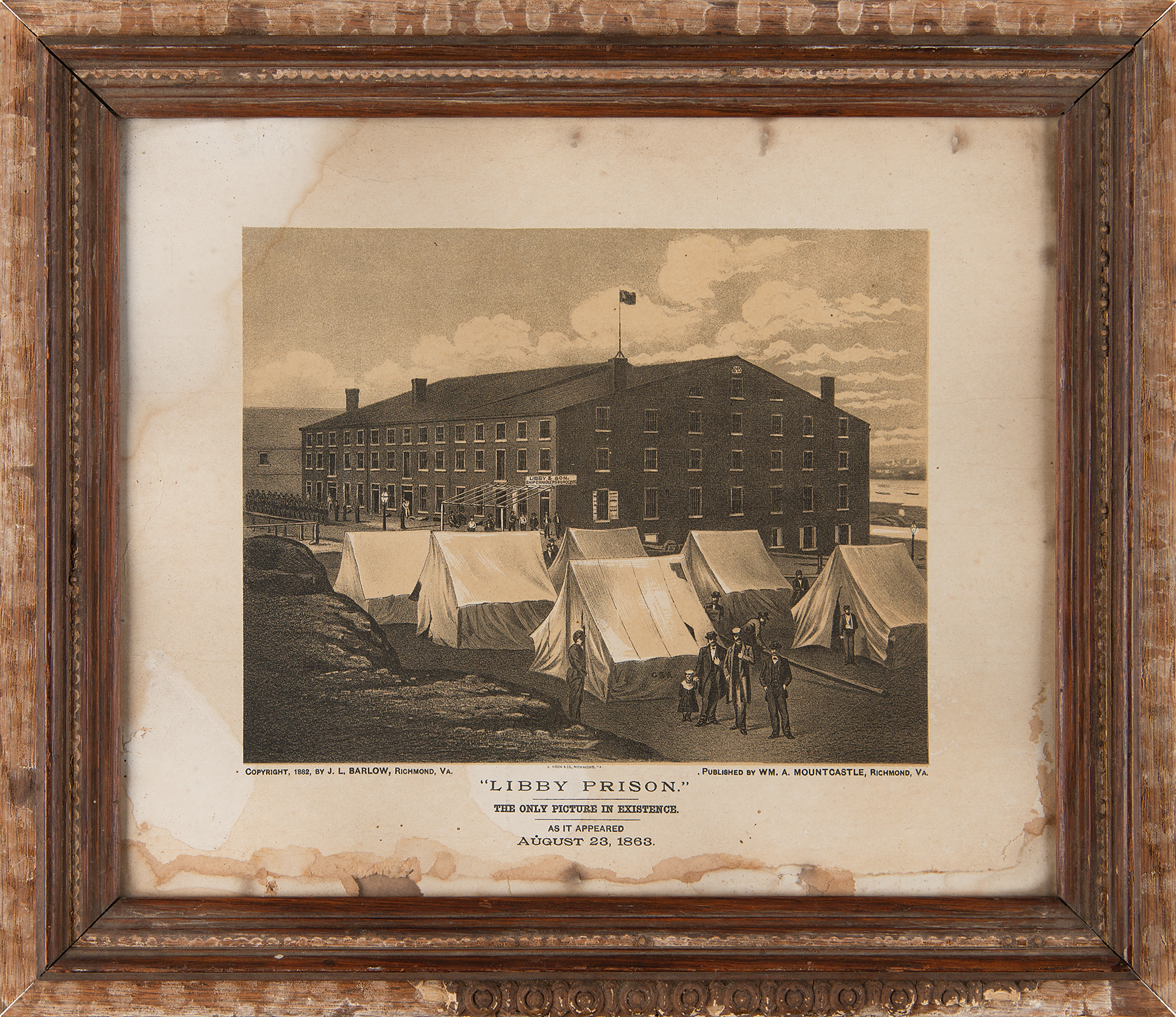 Uncommon 11.75 x 10 lithograph entitled "Libby Prison, the only picture in existence, as it appeared August 23, 1863," with the copyright notice in the lower border reading: "Copyright, 1882, by J. L. Barlow, Richmond, Va., Published by Wm. A. Mountcastle, Richmond Va." Displayed in a worn 14.75 x 13 frame. In good to very good condition, with moderate overall staining, soiling, and losses to edges.