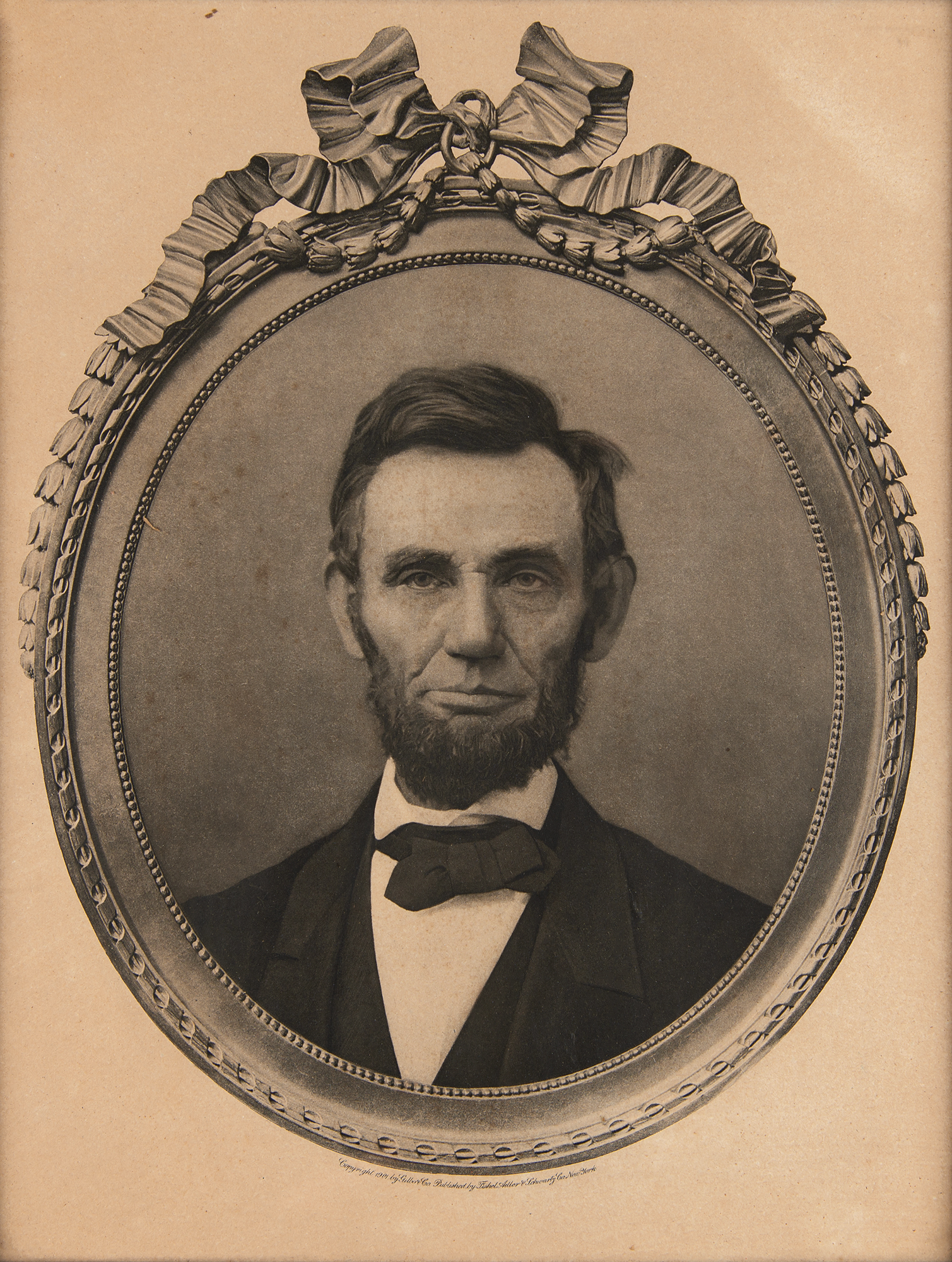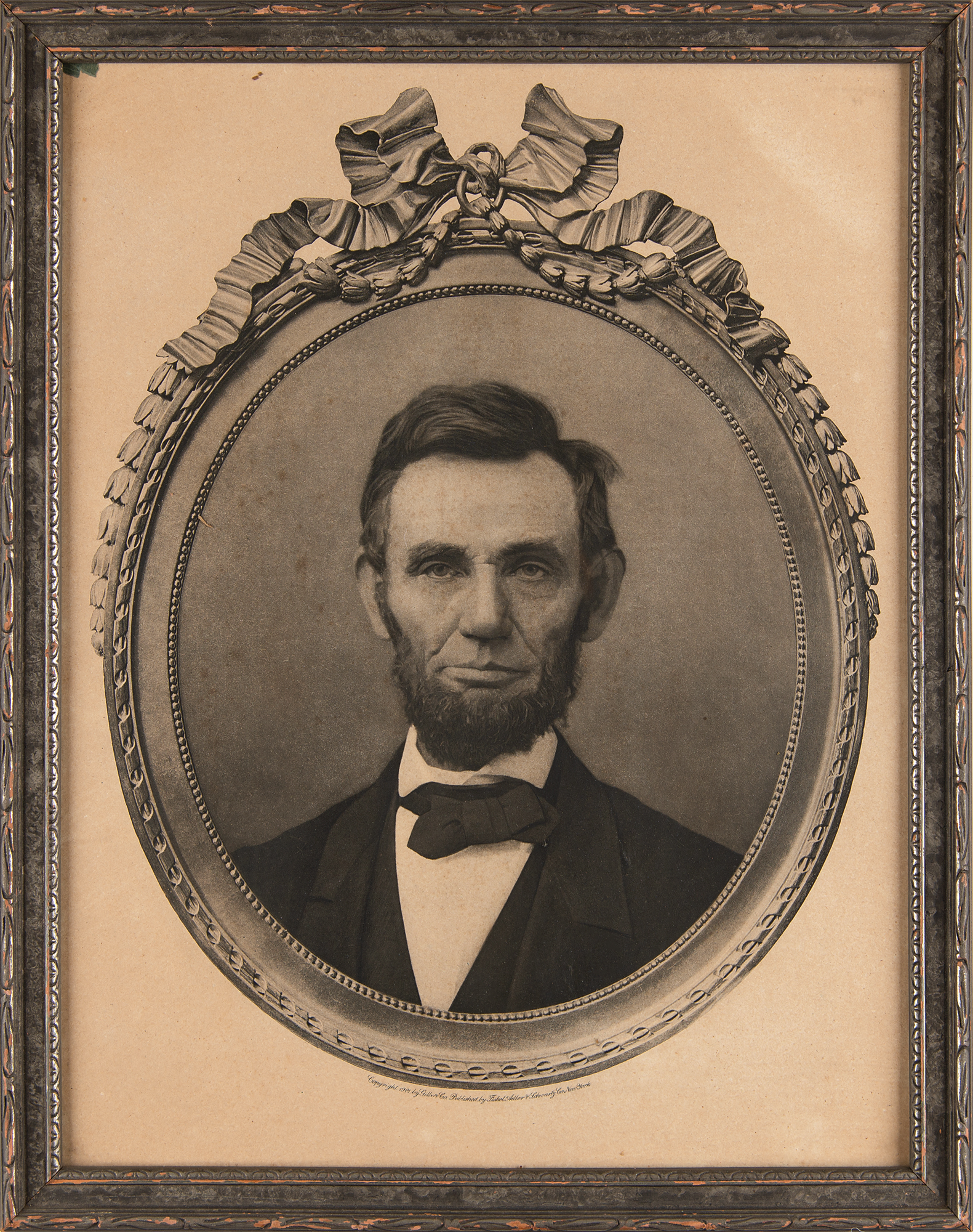 Fantastic 10.5 x 13.5 photogravure portrait of President Abraham Lincoln facing forward, after a photograph taken on November 8, 1863, in Washington, D.C. by Alexander Gardner, with a copyright notice in the lower border: "Copyright 1901 by Gilbo & Co. Published by Fishel, Adler & Schwartz Co., New York." Framed to an overall size of 12 x 15. In fine condition, with light, uniform toning.