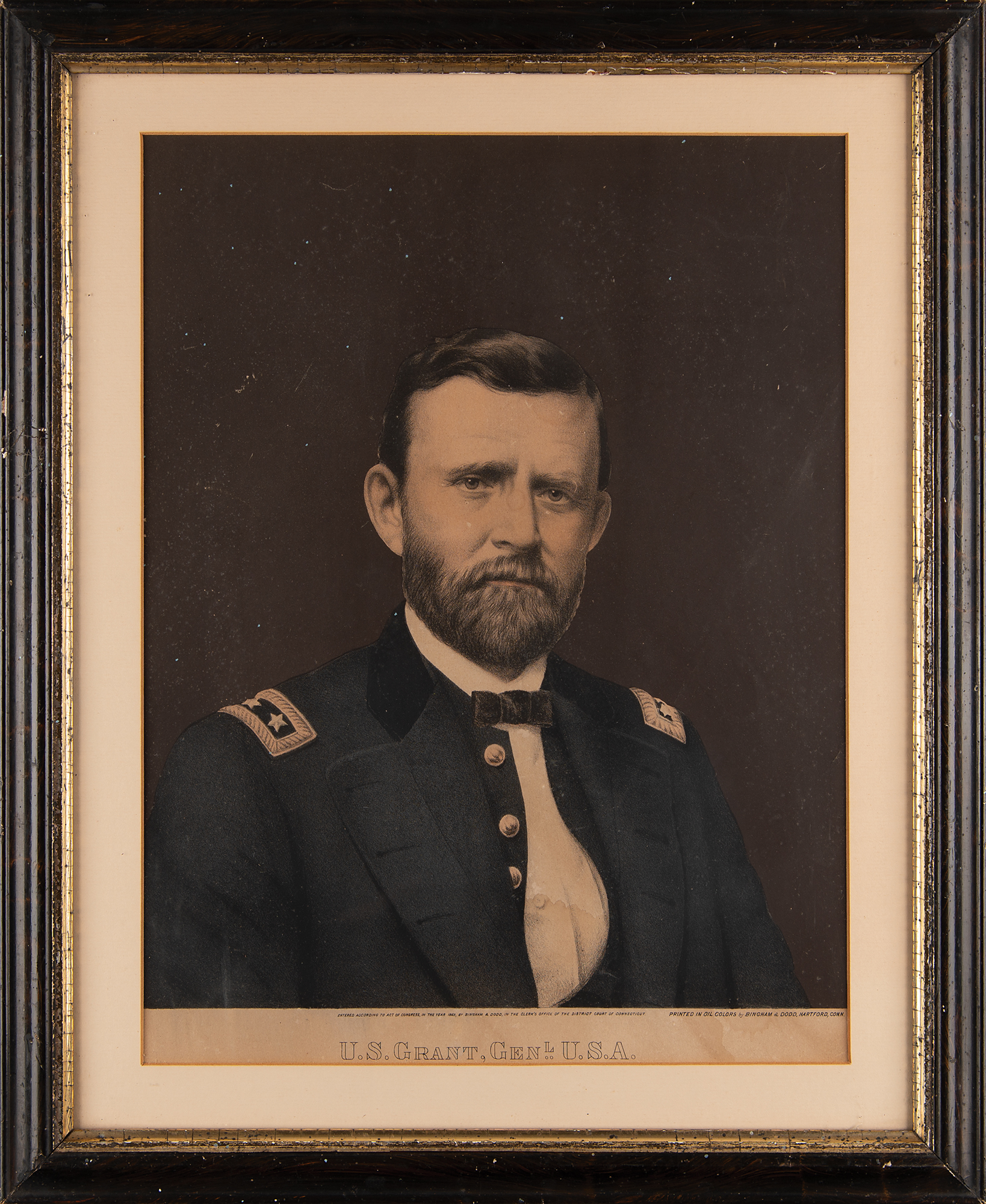 Attractive color 12 x 16 engraving of General Ulysses S. Grant in his Union Army uniform, with the copyright notice in the lower border: "ntered according to Act of Congress, in Year 1866, by Bingham & Dodd, in the Clerk's Office of the District Court of Connecticut. Printed in oil colors by Bingham & Dodd, Hartford, Conn." Matted and framed to an overall size of 17 x 21. In very good to fine condition, with some minor dampstaining.