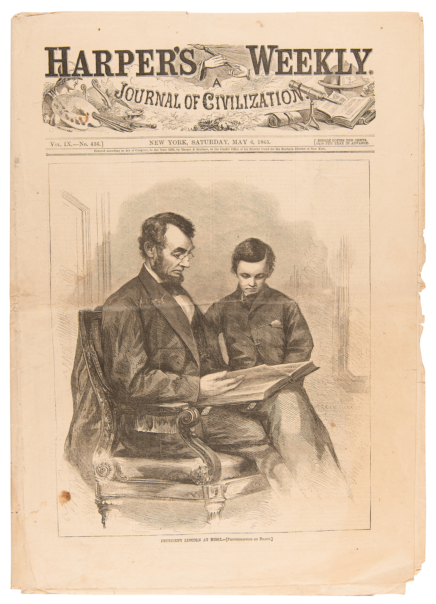 Complete issue of Harper's Weekly from May 6, 1865, Vol. IX, No. 436, 15 pages (pp. 274 - 288), 11.5 x 16.5, with the front page featuring a large engraving of President Lincoln and his youngest son, Tad, entitled below, “President Lincoln at Home,” an image replicated from Mathew Brady’s classic photograph taken on February 9, 1864. Titles for other illustrations found within include: “Scene at the Death-Bed of President Lincoln,” “President Lincoln's Funeral Procession in Washington City,” “President Lincoln's Funeral-Service at the White House,” “President Lincoln’s Funeral—Citizens Viewing the Body at the City Hall, New York,” “Ford’s Theatre at Washington,” and more. In very good to fine condition, with pages uncut, some edge tears and fraying to interior pages, and some scattered staining.