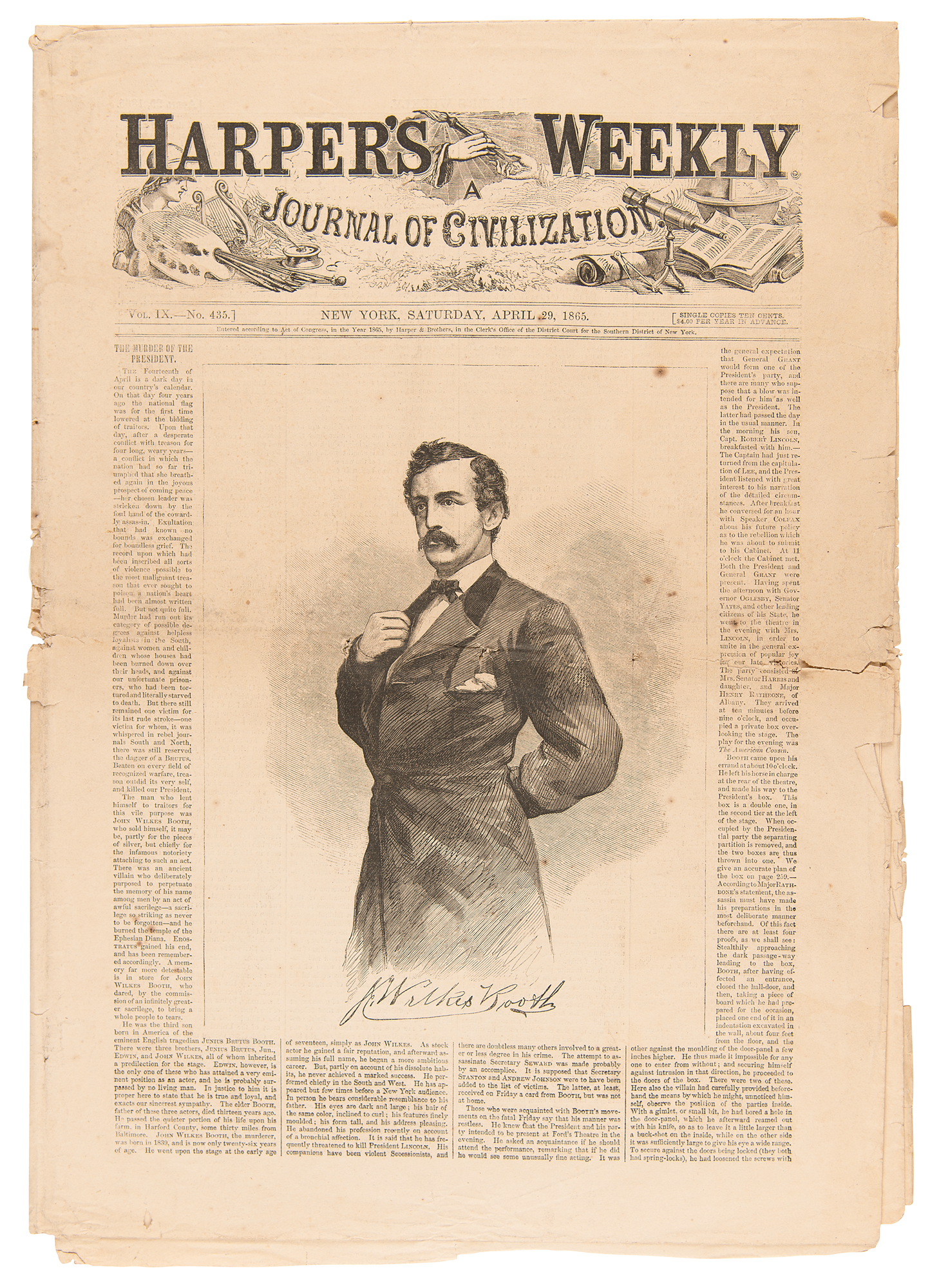 Complete issue of Harper's Weekly from April 29, 1865, Vol. IX, No. 435, 15 pages (pp. 258 - 272), 11.5 x 16.5, with the front page featuring a large engraving of John Wilkes Booth, with his facsimile signature below. The lead story, "The Murder of the President," chronicles the tragic events of April 14, 1865. Other illustrations found within include "The Assassination of President Lincoln at Ford's Theatre," "After the Act," "Plan of the Box Occupied by President Lincoln at Ford's Theatre," and others related to the assassination and ongoing Civil War. In good to very good condition, with pages uncut, several edge tears, some fraying interior pages, and some scattered staining.