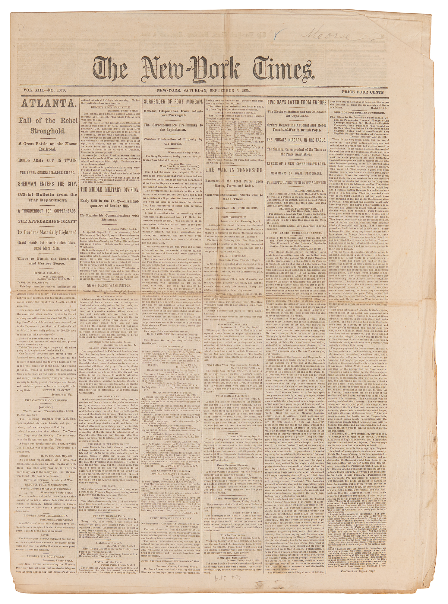 Complete issue of The New-York Times from September 3, 1864, eight pages, 15.25 x 21.5, reporting on William T. Sherman's capture of Atlanta: "Fall of the Rebel Stronghold…Sherman Enters the City." The column opens with a dispatch from the War Department, in part: "This Department has received intelligence this evening that Gen. Sherman's advance entered Atlanta about noon to-day. The particulars have not yet been received, but telegraphic communication during the night with Atlanta direct is expected." The paper includes further news from Atlanta, as well as reports on the surrender of Fort Morgan, the war in Tennessee, and more. In fine condition, with uncut pages, central vertical and horizontal folds, some corner creasing, a contemporary notation to the top margin, and toning to rear page.