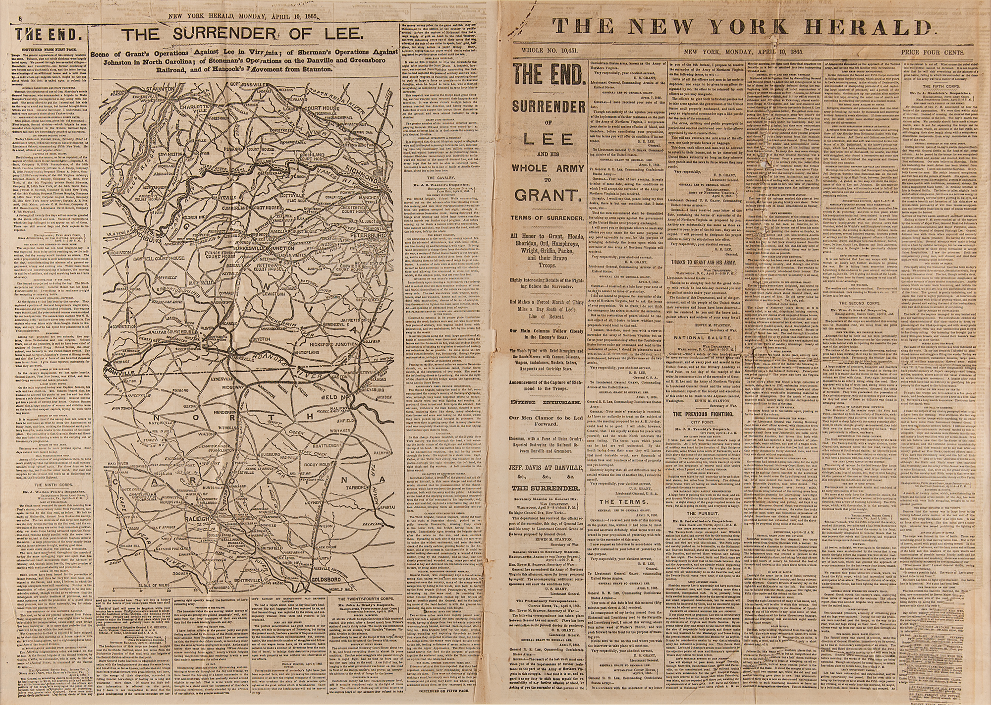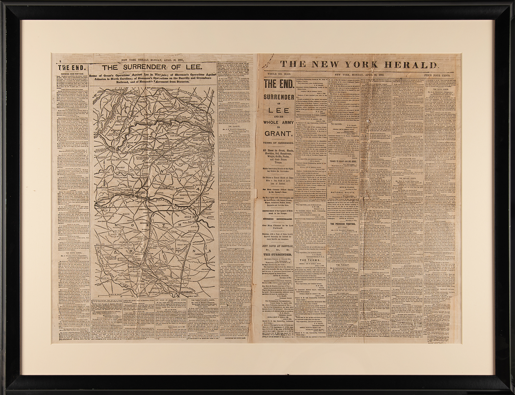 Front and back pages of the New York Herald from April 10, 1865, opened to 30 x 21.5, reporting on the "Surrender of Lee and his Whole Army to Grant." Headlines include: "All Honor to Grant, Meade, Sheridan, Ord, Humphreys, Wright, Griffin, Parke, and their Brave Troops," "The Surrender," "The Terms," and "Jeff. Davis at Danville." The newspaper outlines the terms of the capitulation and publishes some of the correspondence between Gen. U. S. Grant and Gen. Robert E. Lee pertaining to the surrender. The rear page features a large map of Grant's "operations against Lee in Virginia; of Sherman's operations against Johnston in North Carolina; of Stoneman's operations on the Danville and Greensboro Railroad, and of Hancock's movement from Staunton." Impressively matted and framed to an overall size of 38 x 29. In very good to fine condition, with intersecting folds, scattered creasing, and some paper loss.