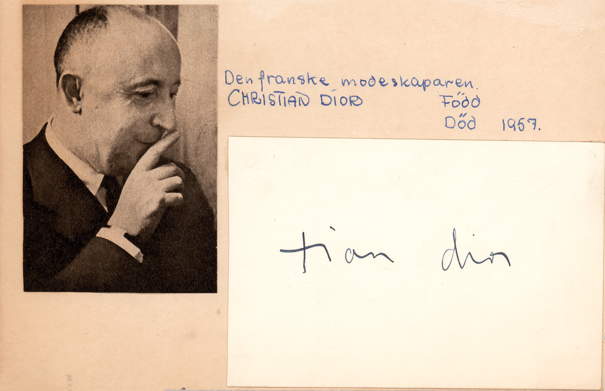 Vintage fountain pen signature by the famous fashion designer, "tian dior,” on a white 4.75 x 3.25 card, mounted to a 7.75 x 5 sheet of cardstock with an image of Christian Dior. In fine condition.