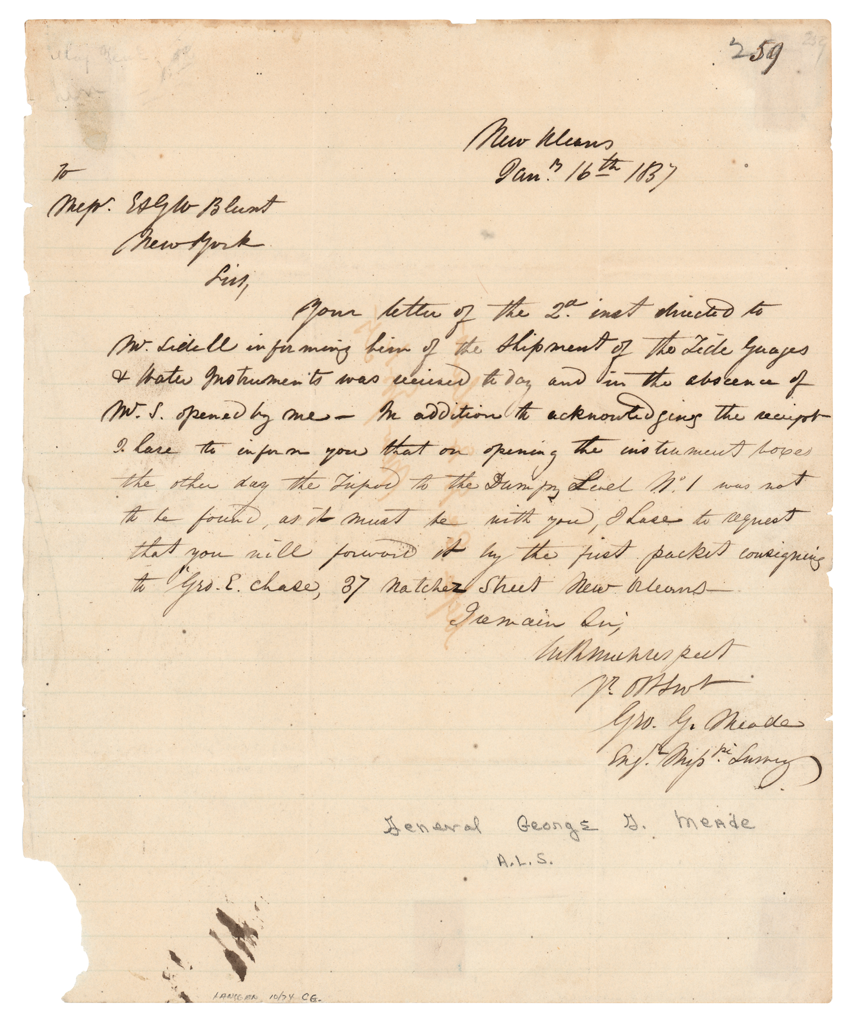 Early ALS signed “Geo. G Meade, Eng'r Miss'pi Survey,” one page, 8 x 9.75, January 16, 1837. Addressed from New Orleans, a handwritten letter to E. & G.W. Blunt, in part: “Your letter of the 2d. inst. directed to Mr. Liddell informing him of the shipment of the Tide Guages & Water Instruments was received today…In addition to acknowledging the receipt I have to inform you that on opening the instrument boxes the other day the Tripod to the Dumpy Level No. 1 was not to be found, as it must be with you, I have to request that you will forward it by the first packet consigning to Geo. E. Chase, 37 Natchez Street, New Orleans.” In very good to fine condition, with paper loss to the lower left corner, and show-through from mounting remnants on the back.