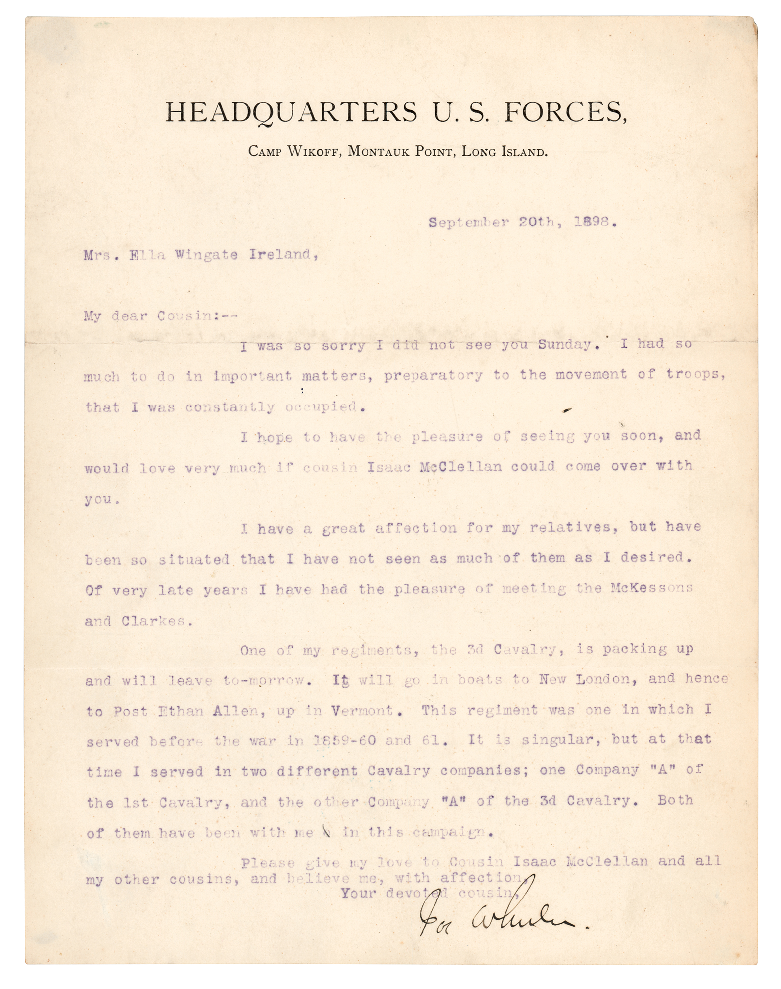 Confederate major general (1836-1906), known as 'Fightin' Joe,' who led his troops in vigorous opposition to Sherman during the Atlanta campaign. TLS signed “Jos. Wheeler,” one page, 8.25 x 10.5, Headquarters U.S. Forces (Camp Wikoff, Montauk Point, Long Island) letterhead, September 20, 1898. Letter to his cousin, Ella Wingate Ireland, in full: “I was so sorry I did not see you Sunday. I had so much to do in important matters, preparatory to the movement of troops, that I was constantly occupied. I hope to have the pleasure of seeing you soon, and would love very much if cousin Isaac McClellan could come over with you. I have a great affection for my relatives, but have been so situated that I have not seen as much of them as I desired. Of very late years I have had the pleasure of meeting the McKessons and Clarkes. One of my regiments, the 3d Cavalry, is packing up and will leave to-morrow. It will go in boats to New London, and hence to Post Ethan Allen, up in Vermont. This regiment was one in which I served before the war in 1859-60 and 61. It is singular, but at that time I served in two different Cavalry companies; one Company ‘A’ of the 1st Cavalry, and the other Company ‘A’ of the 3d Cavalry. Both of them have been with me in this campaign. Please give my love to Cousin Isaac McClellan and all my other cousin.” In fine condition, with light show-through at the corners from small mounting remnants on the back.