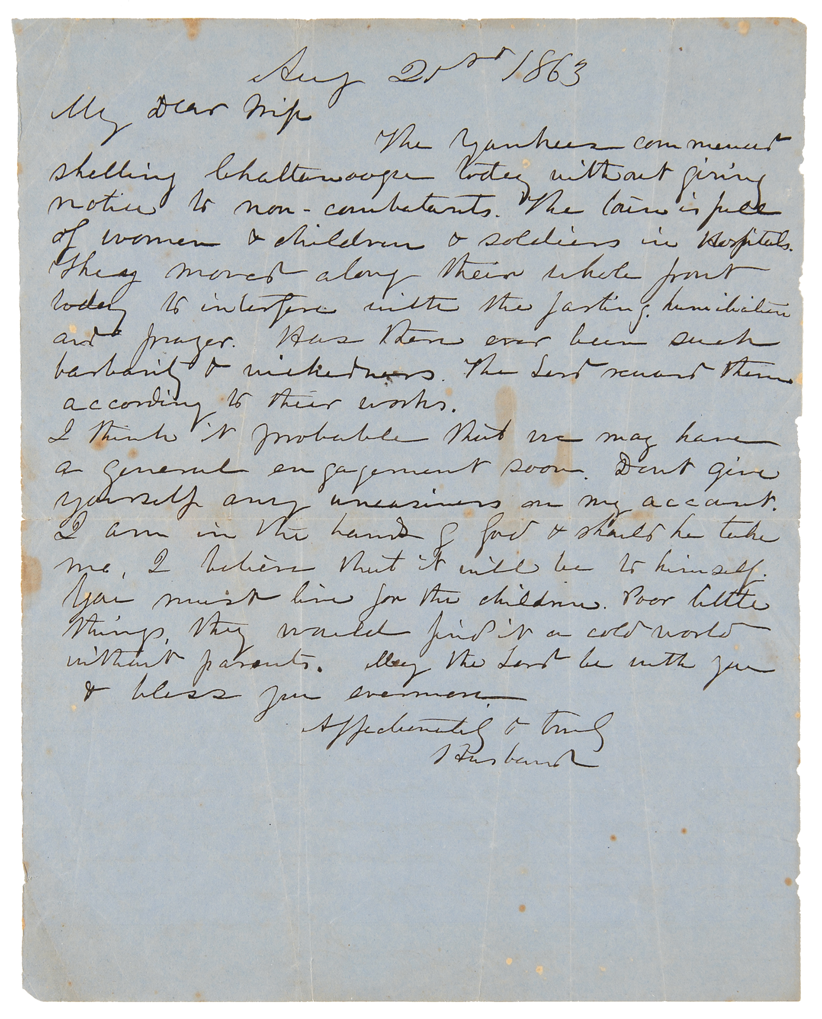 Confederate General (1821–1889) and brother-in-law of Thomas 'Stonewall' Jackson. Civil War-dated ALS signed "Husband," one page, 8 x 10, August 21, 1863. Handwritten letter to his wife, with news of the early siege of Chattanooga by Union forces, which culminated in the Battle of Chickamauga. In full: “The Yankees commenced shelling Chattanooga today without giving notice to non-combatants. The town is full of women & children & soldiers in Hospitals. They moved along their whole front today to interfere with the fasting, humiliation and prayer. Has there ever been such barbarity & wickedness. The Lord reward them according to their works. I think it probable that we may have a general engagement soon. Don't give yourself any uneasiness on my account. I am in the hand of God & shall he take me, I believe that it will be to himself. You must live for the children. Poor little things, they would find it a cold world without parents. May the Lord be with you & bless you evermore.” In very good condition, with overall creasing and scattered small stains.