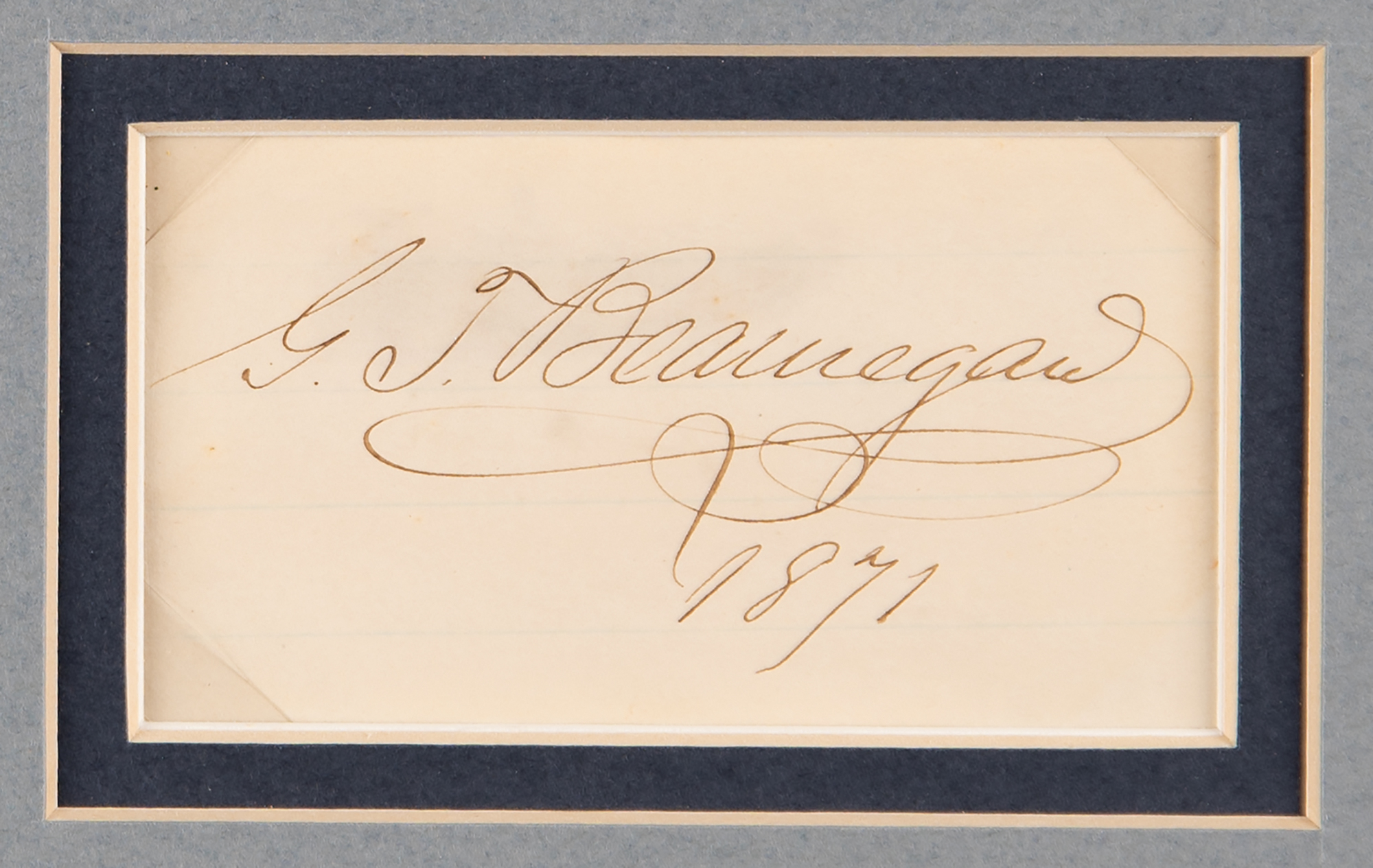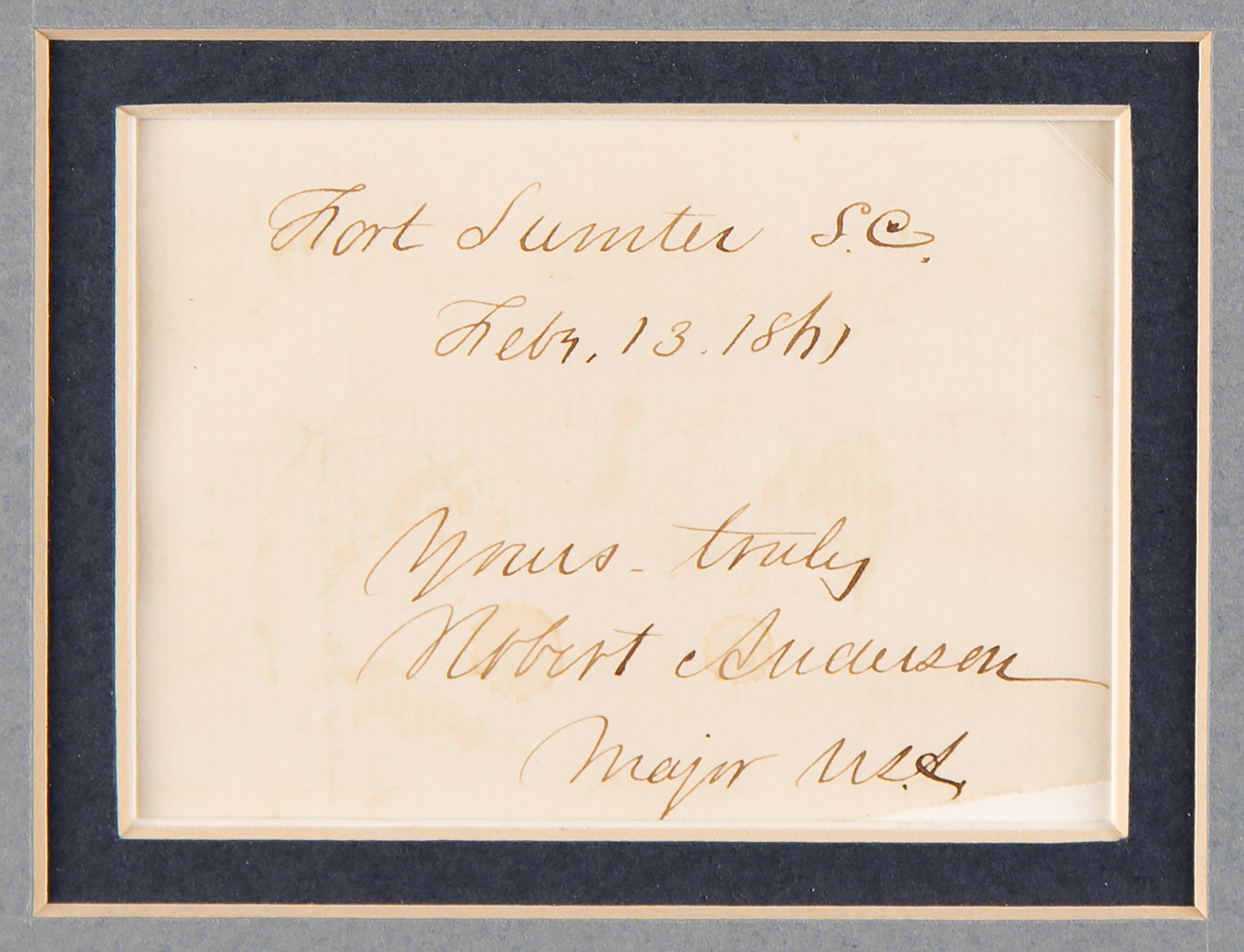 Ink signatures of the two principal commanders of the Battle of Fort Sumter: Robert Anderson, “Fort Sumter, S.C., Feby 13, 1861, Yours truly, Robert Anderson, Major U.S.A.,” on an off-white 3 x 2.25 sheet; and P. G. T. Beauregard, “G. T. Beauregard, 1871,” on an off-white 3.25 x 1.75 sheet. Double-matted together with portraits of both men to an overall size of 12 x 12. In overall fine condition, with paper loss to the lower right corner of the Anderson slip.