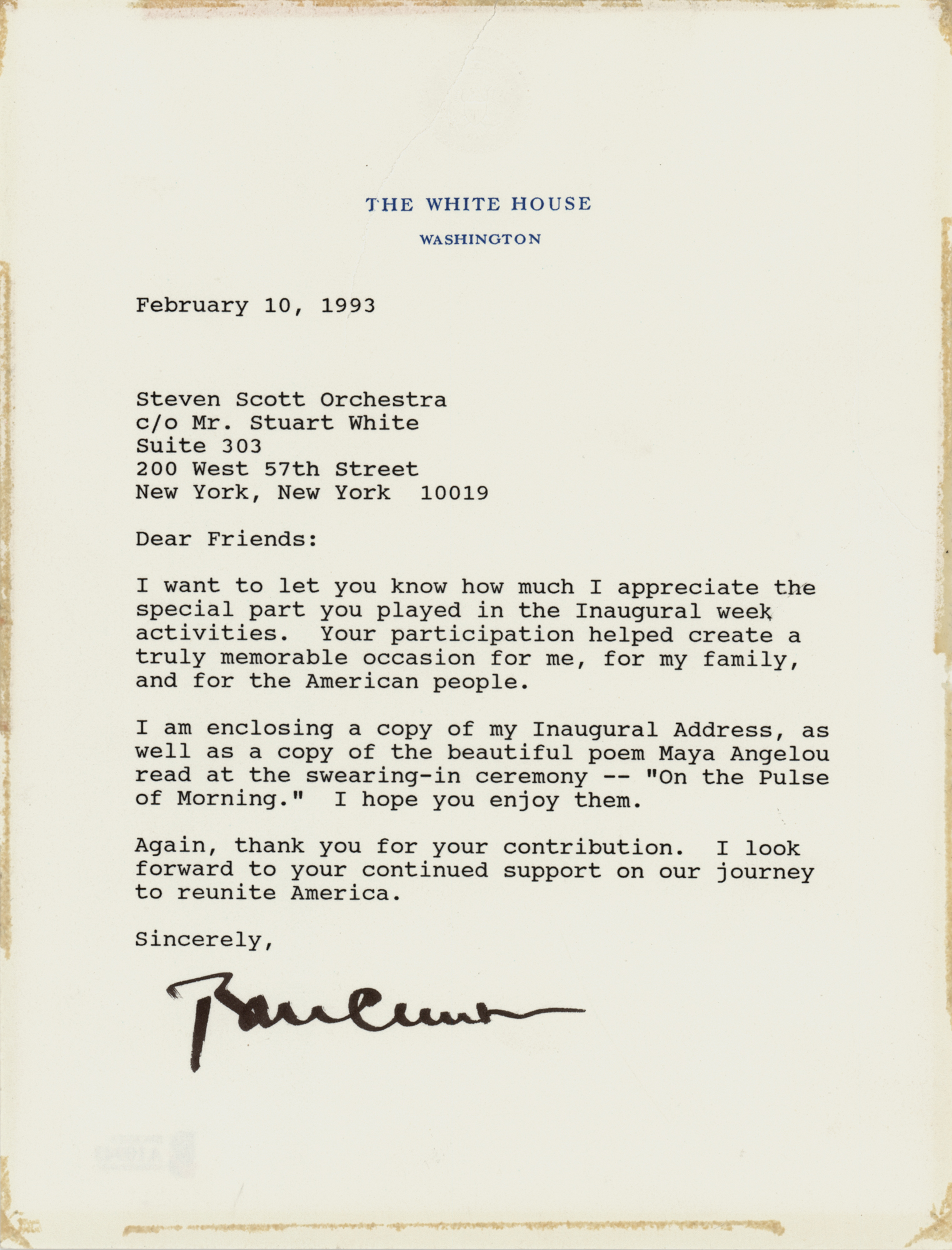 TLS as president, one page, 6.75 x 8.75, White House letterhead, February 10, 1993. Letter to the Steven Scott Orchestra, in full: “I want to let you know how much I appreciate the special part you played in the Inaugural week activities. Your participation helped create a truly memorable occasion for me, for my family, and for the American people. I am enclosing a copy of my Inaugural Address, as well as a copy of the beautiful poem Maya Angelou read at the swearing-in ceremony — ‘On the Pulse of Morning.’ I hope you enjoy them. Again, thank you for your contribution. I look forward to your continued support on our journey to reunite America.” In very good to fine condition, with old tape stains along the edges, and a repaired tear passing vertically through the letterhead. Accompanied by full letters of authenticity from PSA/DNA and Beckett Authentication Services. The first inauguration of Bill Clinton as the 42nd president of the United States was held on Wednesday, January 20, 1993, only 21 days before this letter was written.