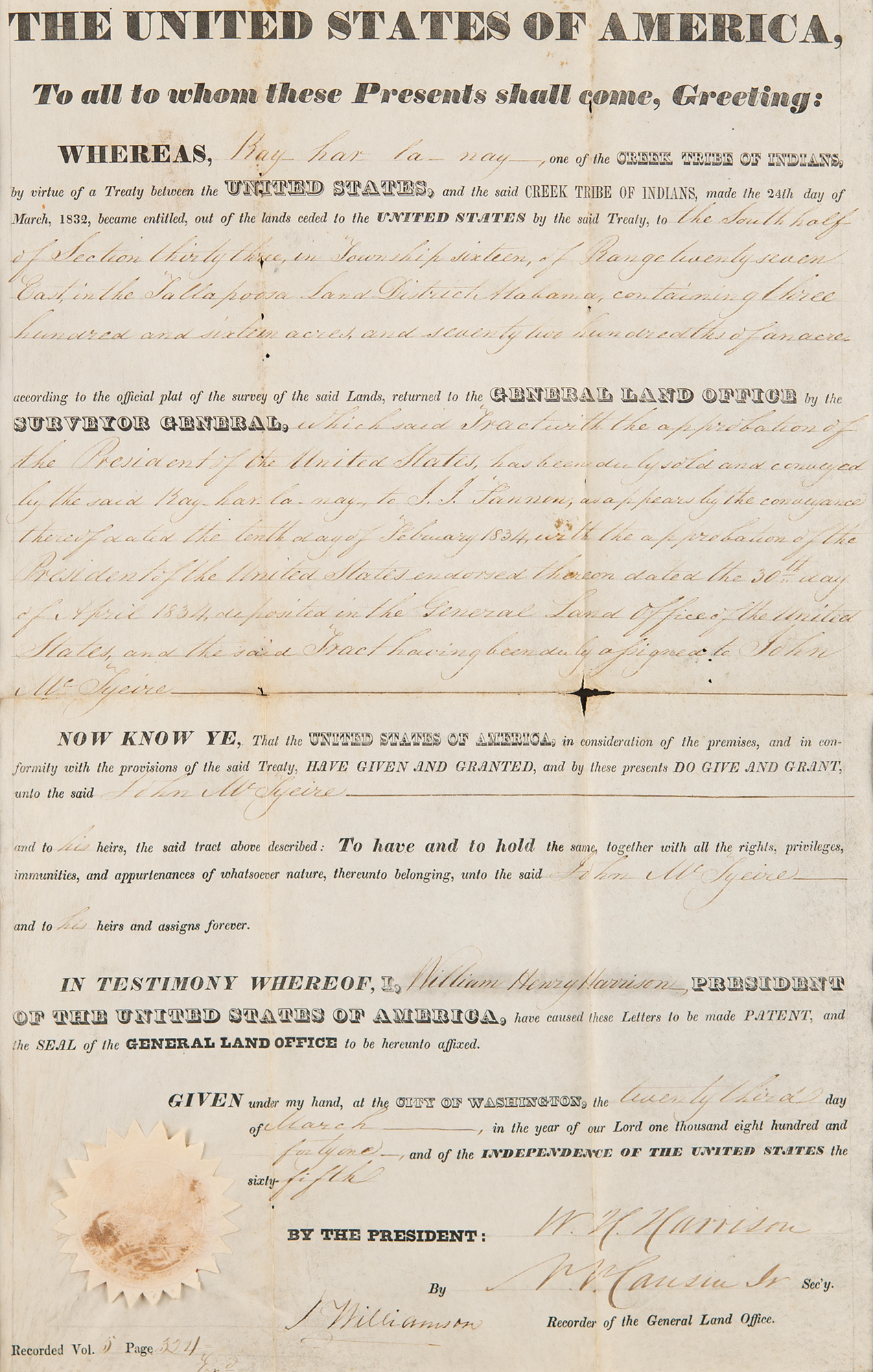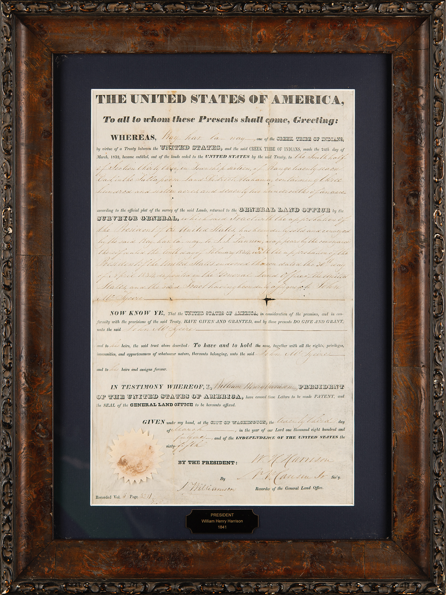 Partly-printed presidential document dated to the administration of William Henry Harrison, one page, 11 x 17, March 23, 1841. Land document affirming that a tract of land “containing three hundred and sixteen acres, and seventy two hundredths of an acre,” which was formerly granted to “Kay har la nay, one of the Creek Tribe of Indians, by virtue of a Treaty between the United States, and the said Creek tribe of Indians, made the 24th day of March, 1832,” having been returned to the General Land Office by the Surveyor General with the approval of the president, “has been duly sold and conveyed by the said Kay hat la nay to J. J. Fannon.” Signed at the conclusion in a secretarial hand on behalf of President Harrison, and countersigned by J. Williamson, recorder of the General Land Office. The lower left retains the original beige paper seal. Impressively matted and framed to an overall size of 18.5 x 24.25. In fine condition, with minor loss along the folds. Due to the extremely busy schedule of the president and the desire to have the West settled as quickly as possible, the task of signing land grants had been relegated to a senate-approved secretary by an act signed into law by Andrew Jackson. This particular land grant is dated to just three days before Harrison became sick with the illness that would take his life on April 4, 1841.