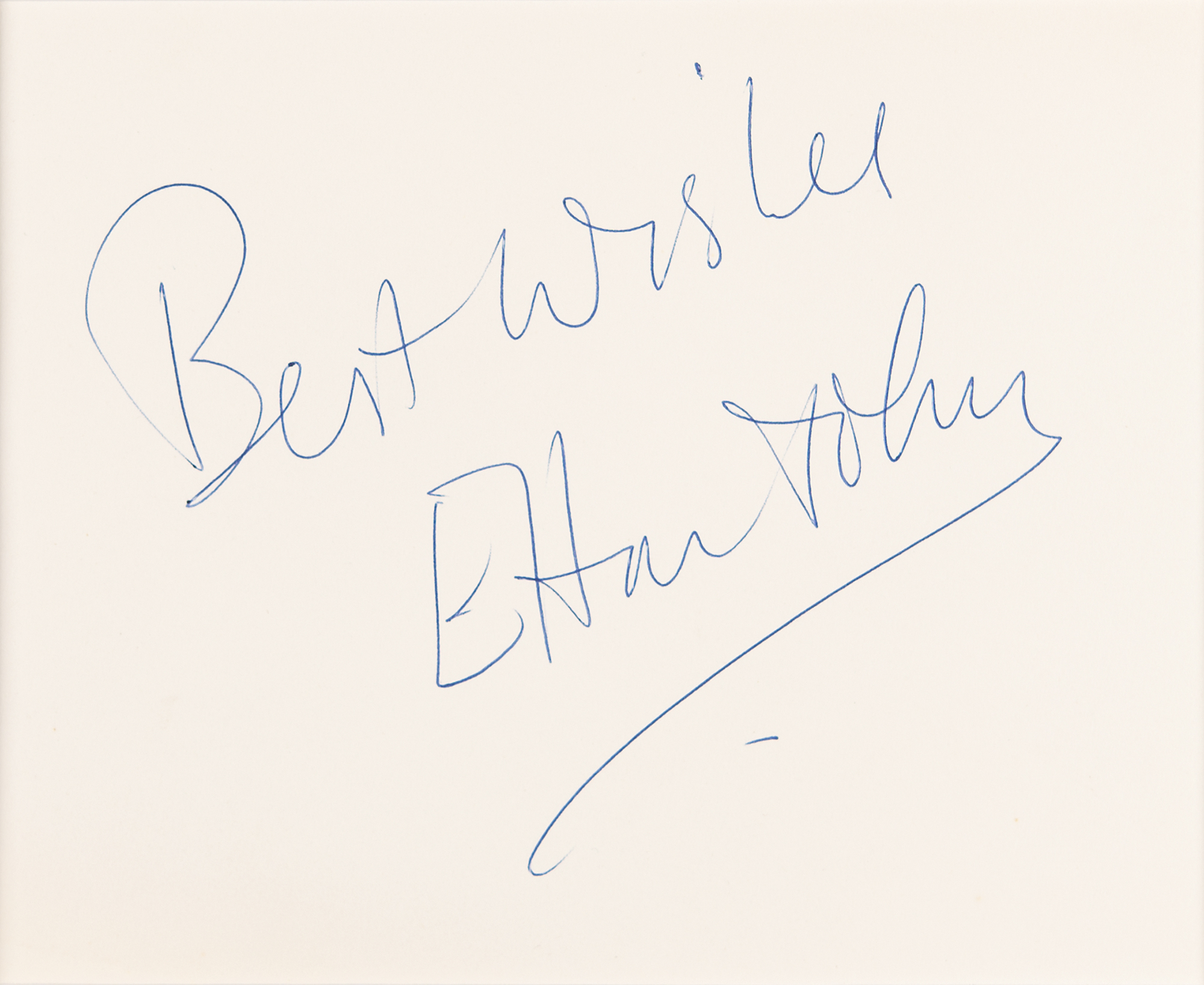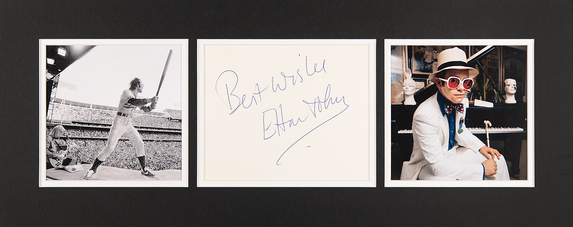 Large ballpoint signature, "Best wishes, Elton John,” on a white 7 x 5.75 sheet. Double-matted with two images to an overall size of 24.5 x 9.75. In very fine condition.