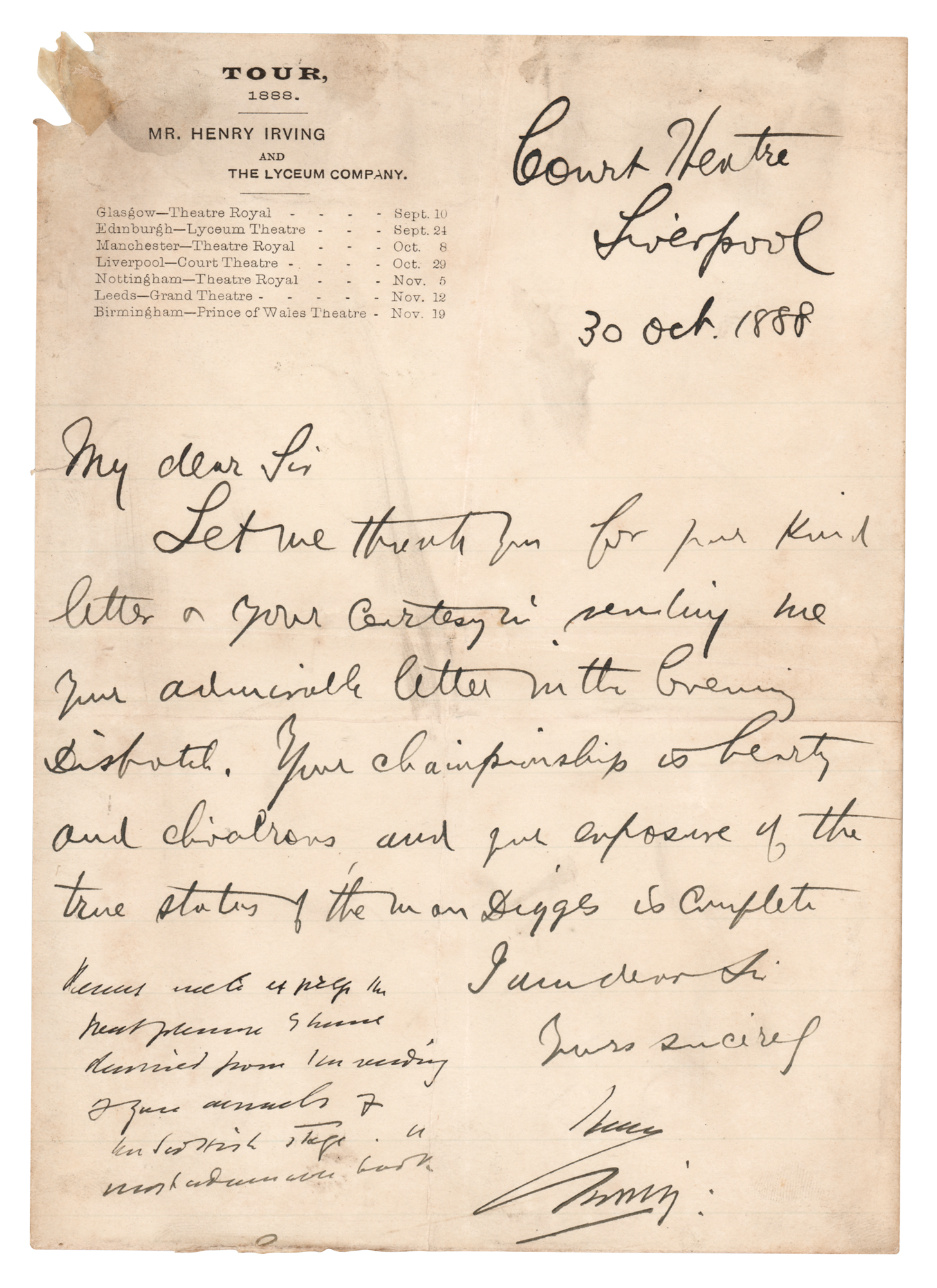 LS signed “Henry Irving,” written in the hand of his secretary, Dracula author Bram Stoker, one page, 5.75 x 8, Lyceum Company Tour letterhead, October 30, 1888. Stoker writes, in full: "Let me thank you for your kind letter and your courtesy sending me your admirable letter in the Evening Dispatch. Your championship is hearty and chivalrous and the exposure of the true status of the man Diggs is complete." In very good to fine condition, with folds and creases, soiling, and paper loss to the upper left corner. Stoker worked as business manager for Henry Irving's world-famous Lyceum Theatre in London between 1879 and 1898, where he supplemented his income by writing a large number of sensational novels—his most famous being the vampire tale Dracula, published in 1897.