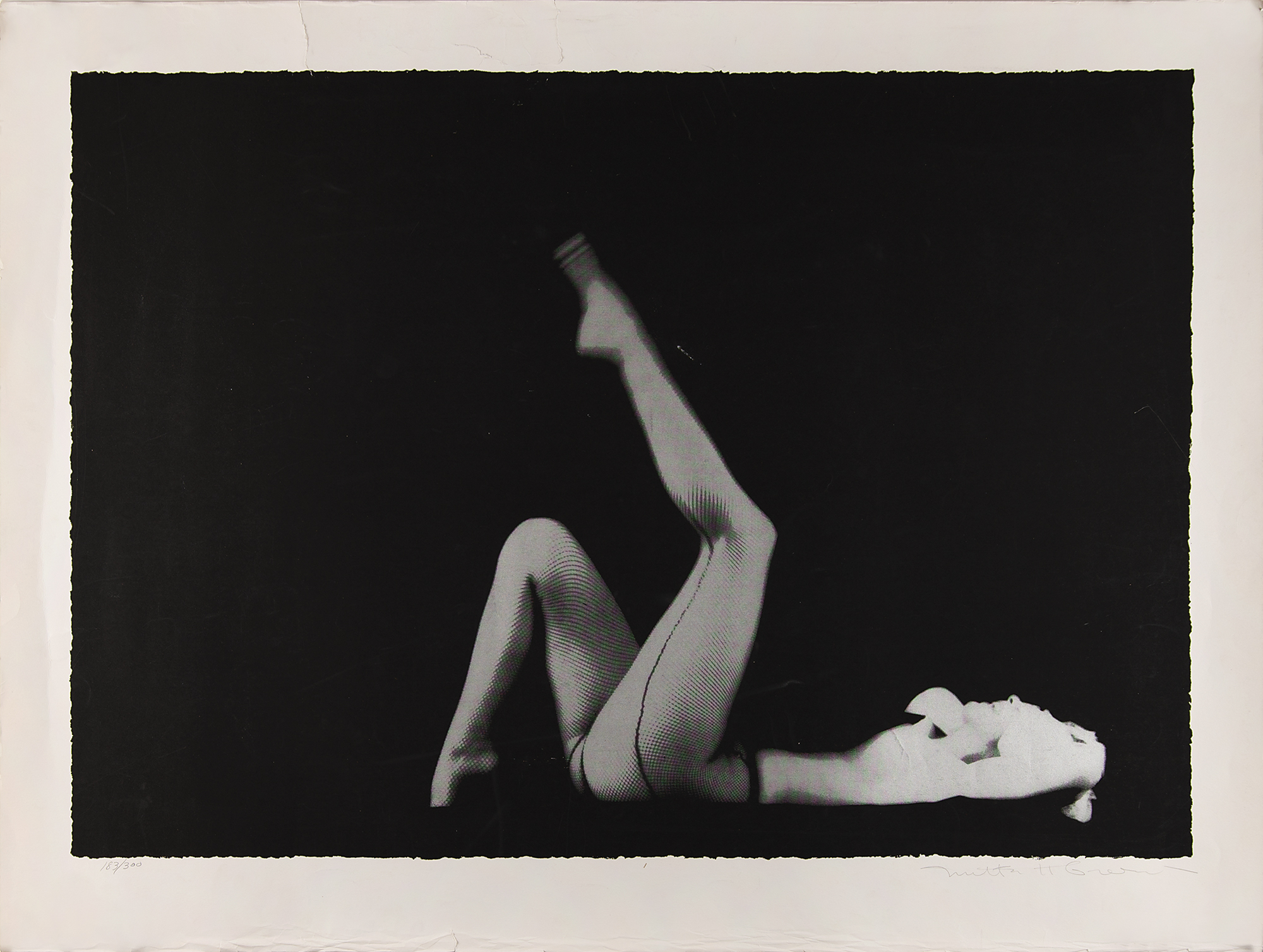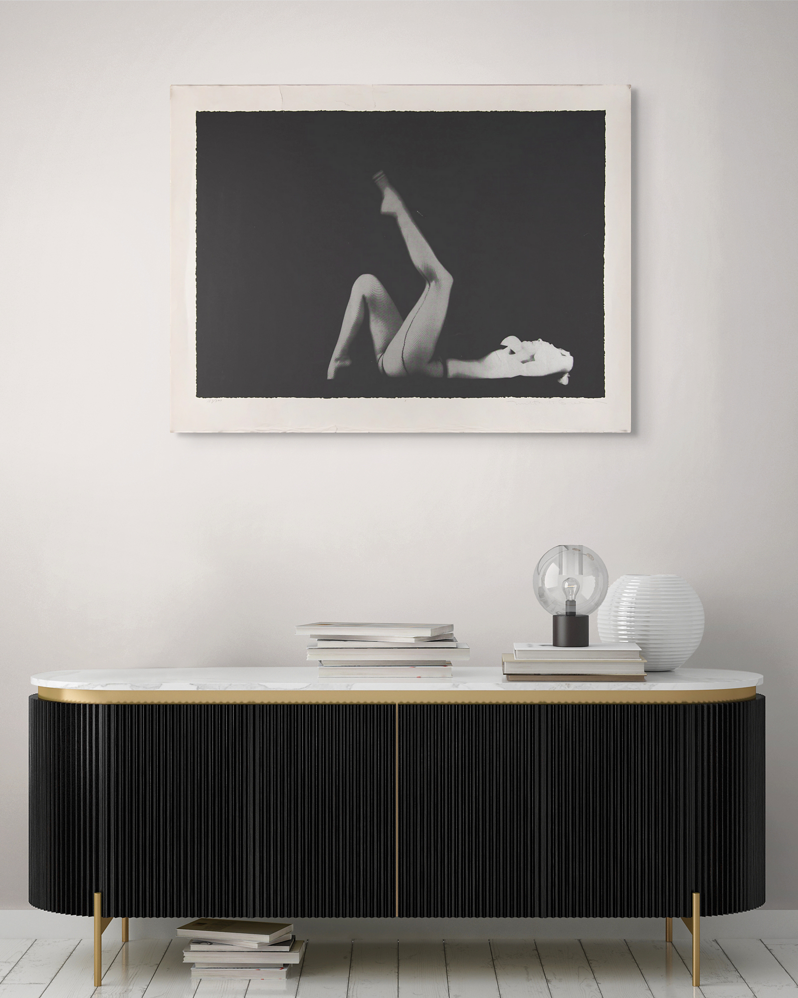 Limited edition 46 x 35 silkscreen print of a Milton Greene photograph of Marilyn Monroe taken during the ‘Black Sitting’ photo session in New York in February 1956, numbered 183/300, signed in the lower border in pencil, “Milton H. Greene.” Rolled and in very good to fine condition, with tears and creasing in the wide borders, which could be successfully matted out to create a stunning display.