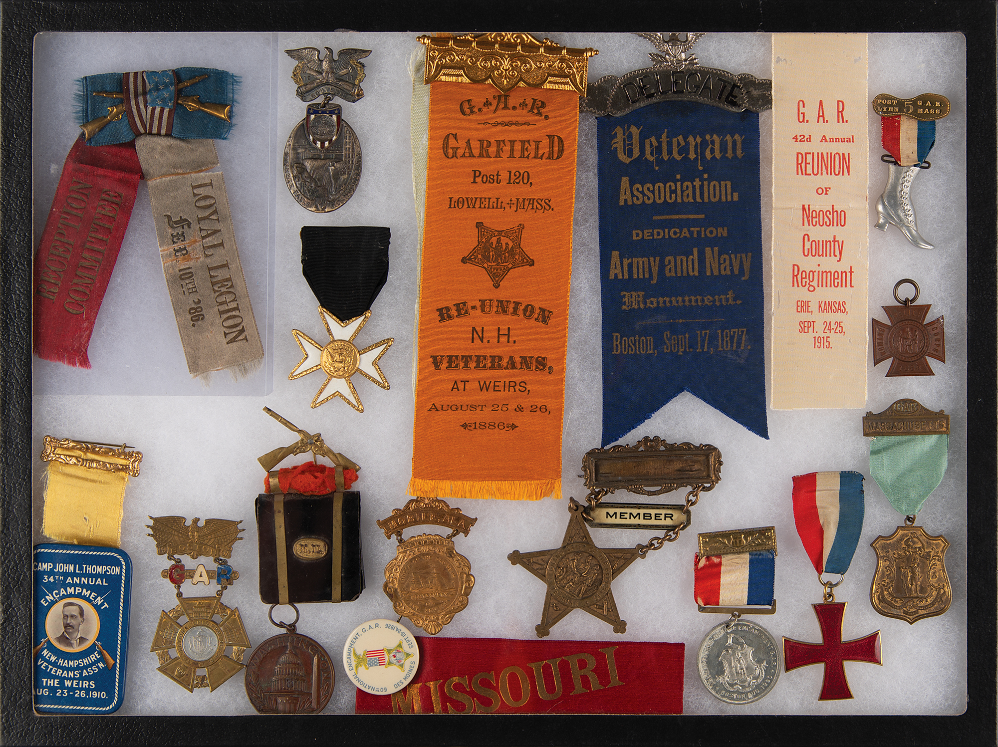 Eye-catching collection of 19 pins, badges, and ribbons, most related to the Grand Army of the Republic, featuring an assortment of colorful pieces from reunions and encampments in Massachusetts, New Hampshire, Kansas, Iowa, Missouri, New York, and Alabama. Displayed together in a 16.25 x 12.25 Riker box. In overall very good to fine condition.