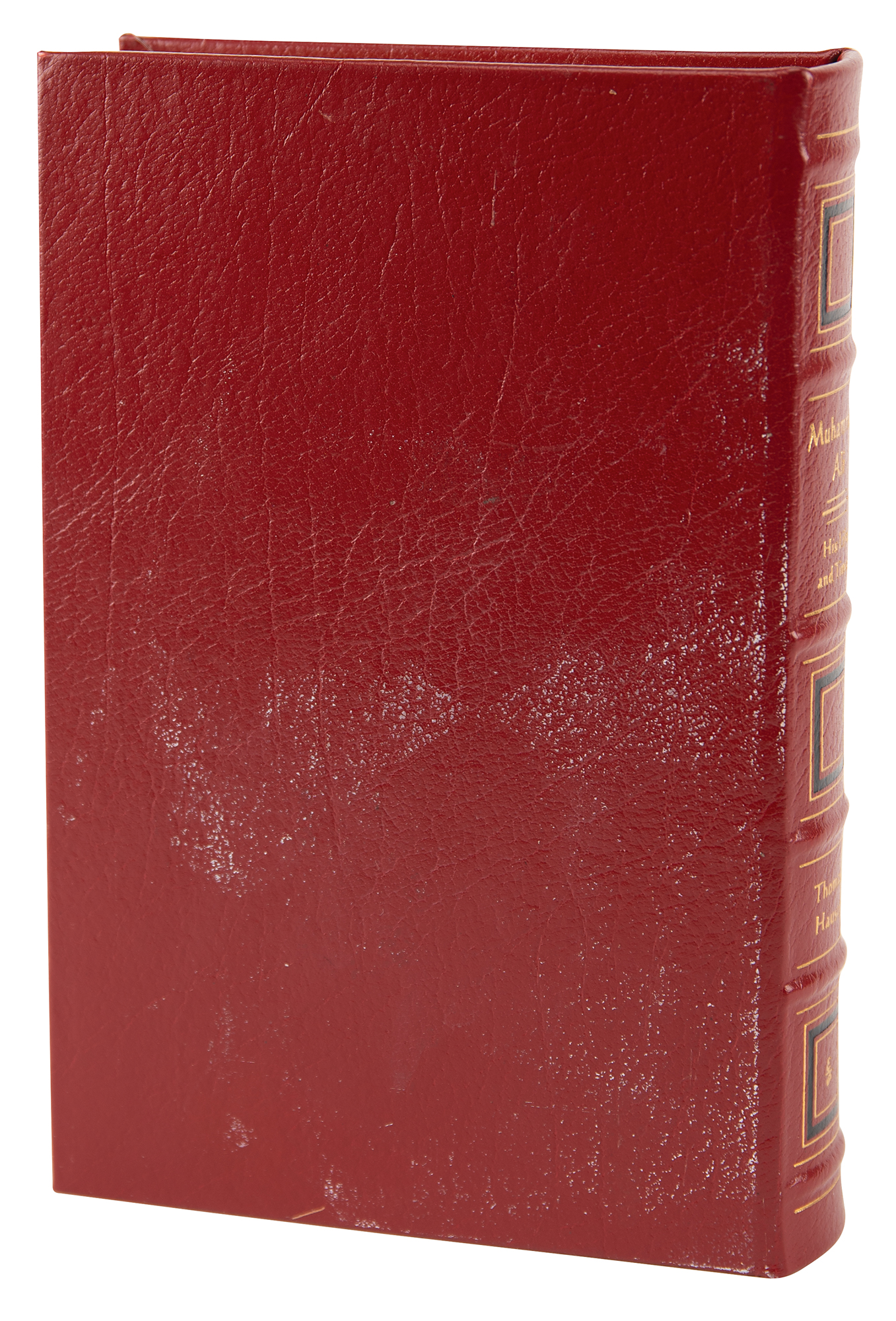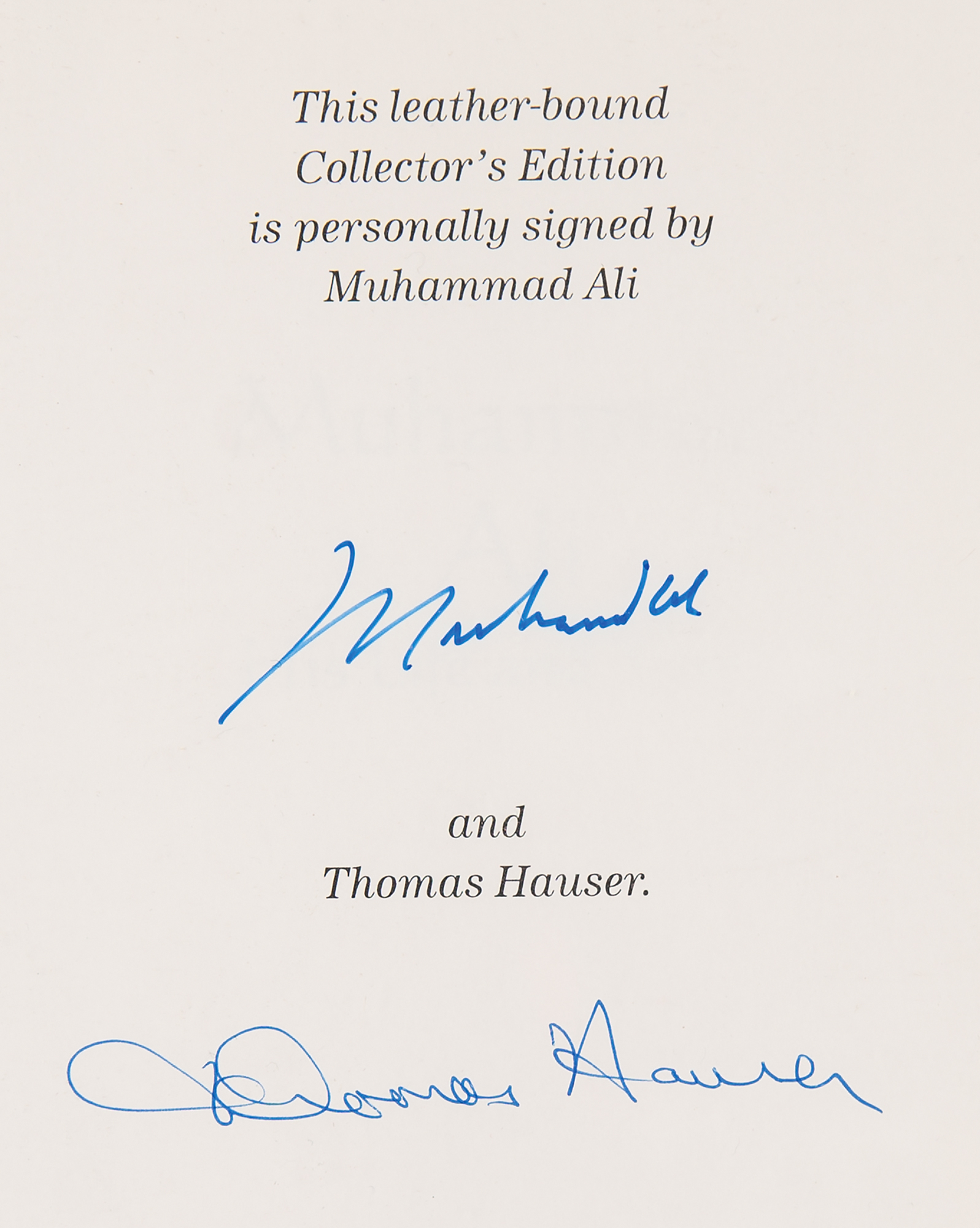 Signed book: Muhammad Ali: His Life and Times. Limited collector's edition, numbered 3319/3500. Norwalk, CT: Easton Press, 1996. Leatherbound hardcover, 6.25 x 9.5, 543 pages. Signed on the colophon in blue felt tip by Muhammad Ali, and in blue ballpoint by the author, Thomas Hauser. In very good to fine condition, with irregular scuffing/rubbing to boards (heaviest to rear board).